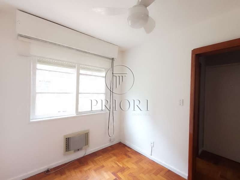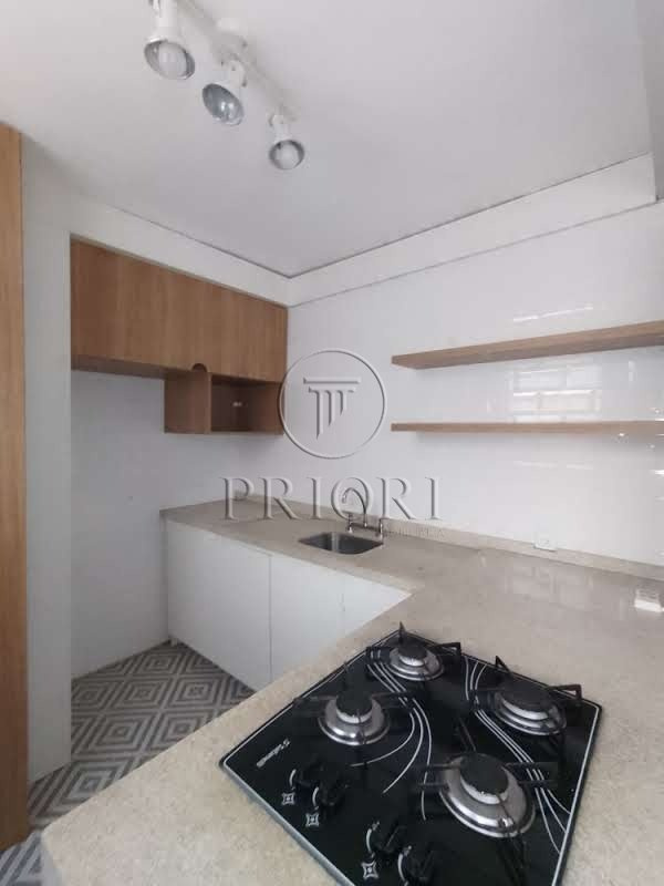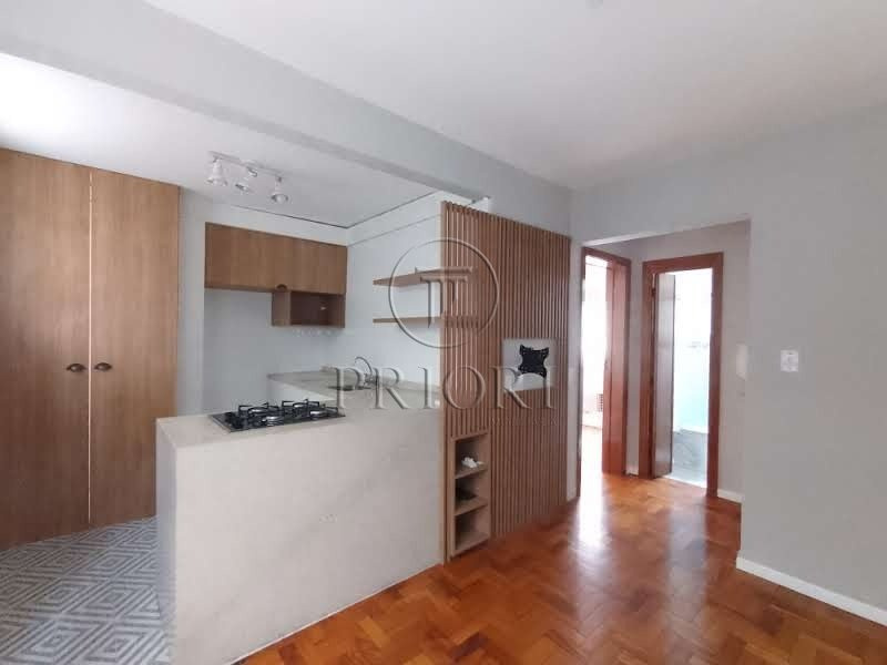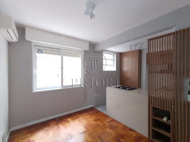 Apartamento semimobiliado com 40m² privativos, living climatizado com cozinha americana integrada, um dormitório com ar condicionado e um banheiro social.