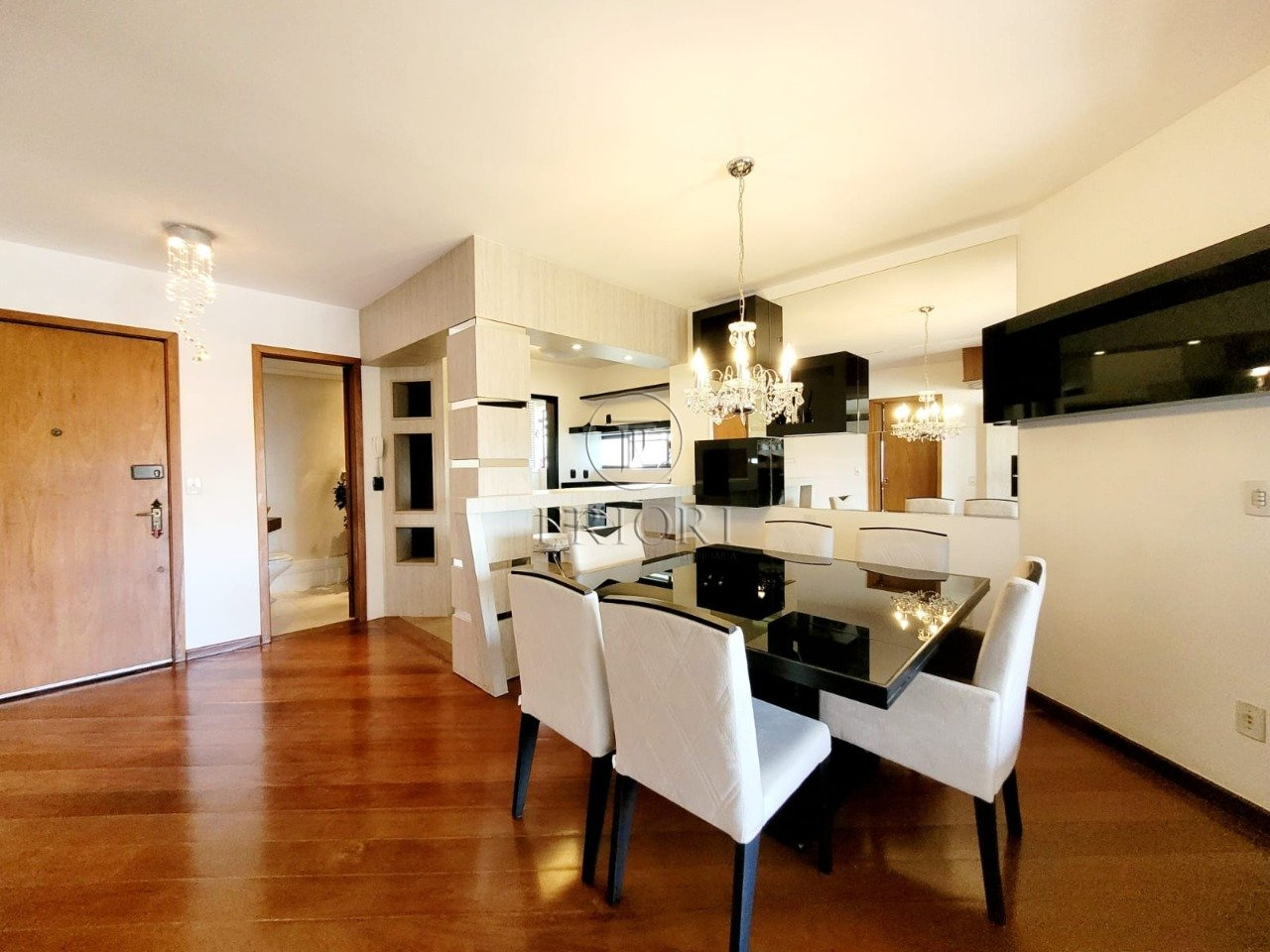 O imóvel dispõe de dois amplos dormitórios bem ensolarados, mobiliados com armários planejados sob medida e totalmente climatizados, banheiro social bem arejado e com ventilação natural, living para três ambientes bem definidos e um lavabo, cozinha americana com total integração ao living, montada e equipada com balcões, armários aéreos e os demais eletrodomésticos e utilitários necessários, área de serviço independente com lavadora/secadora de roupas e armários.