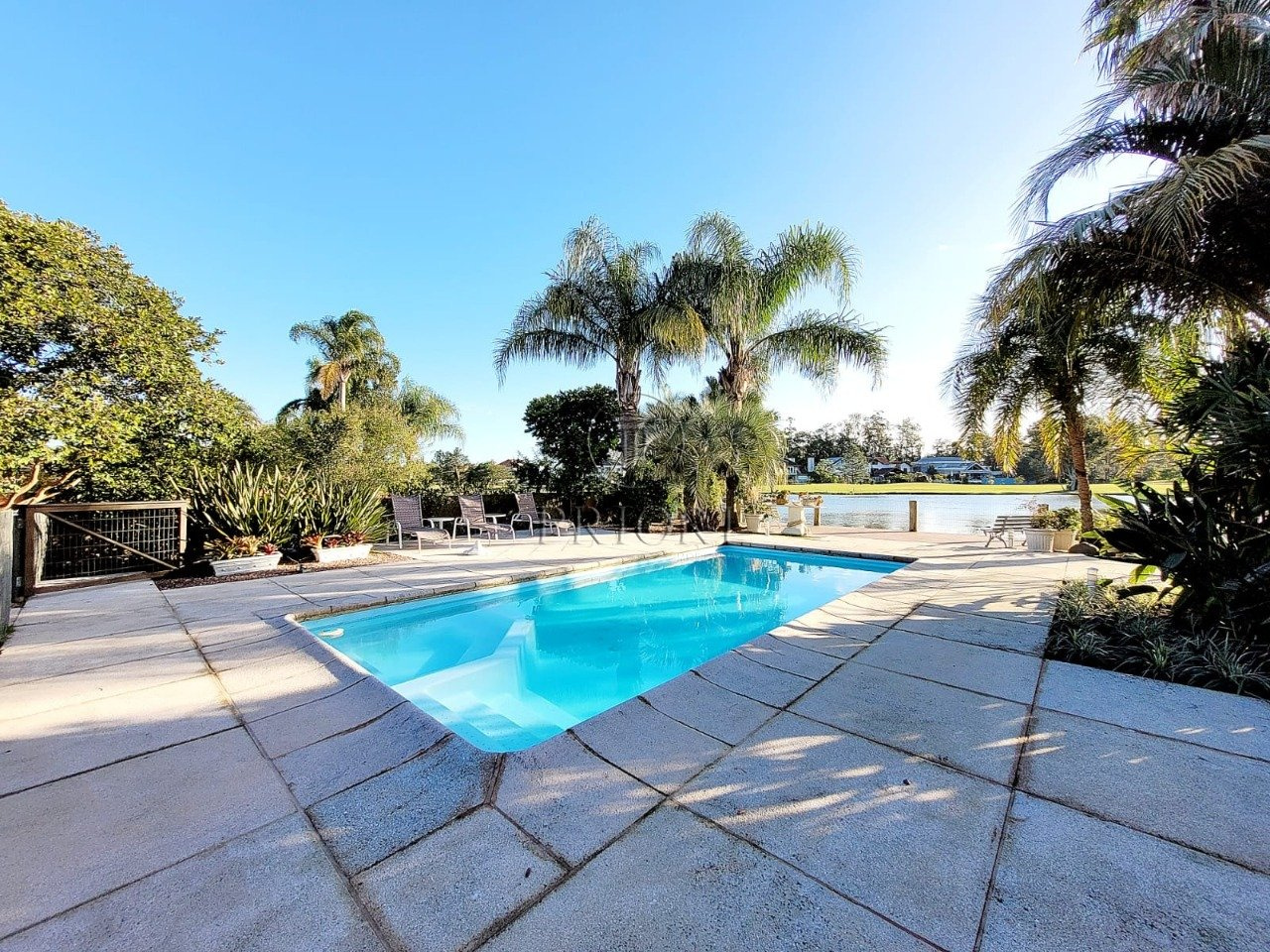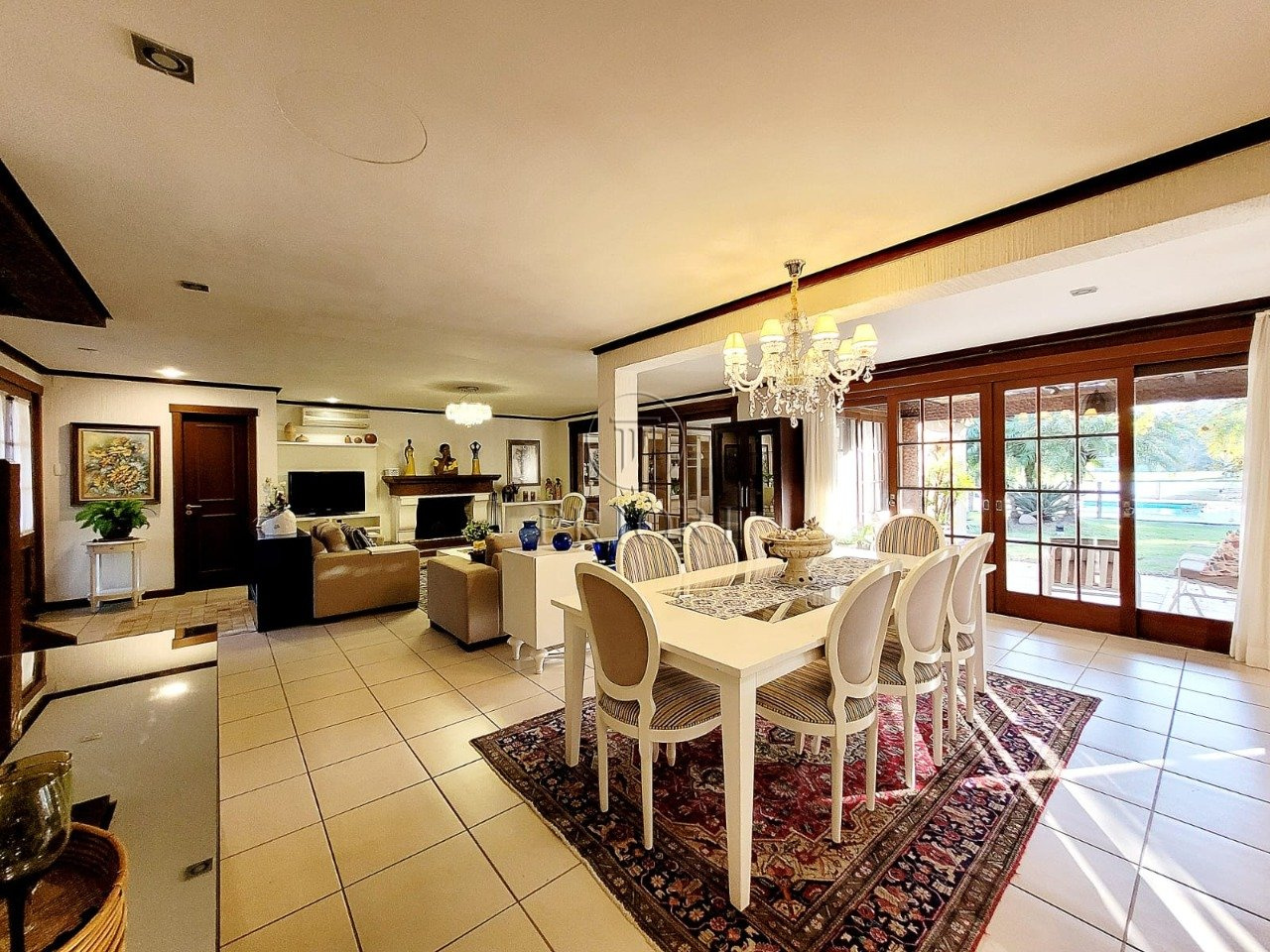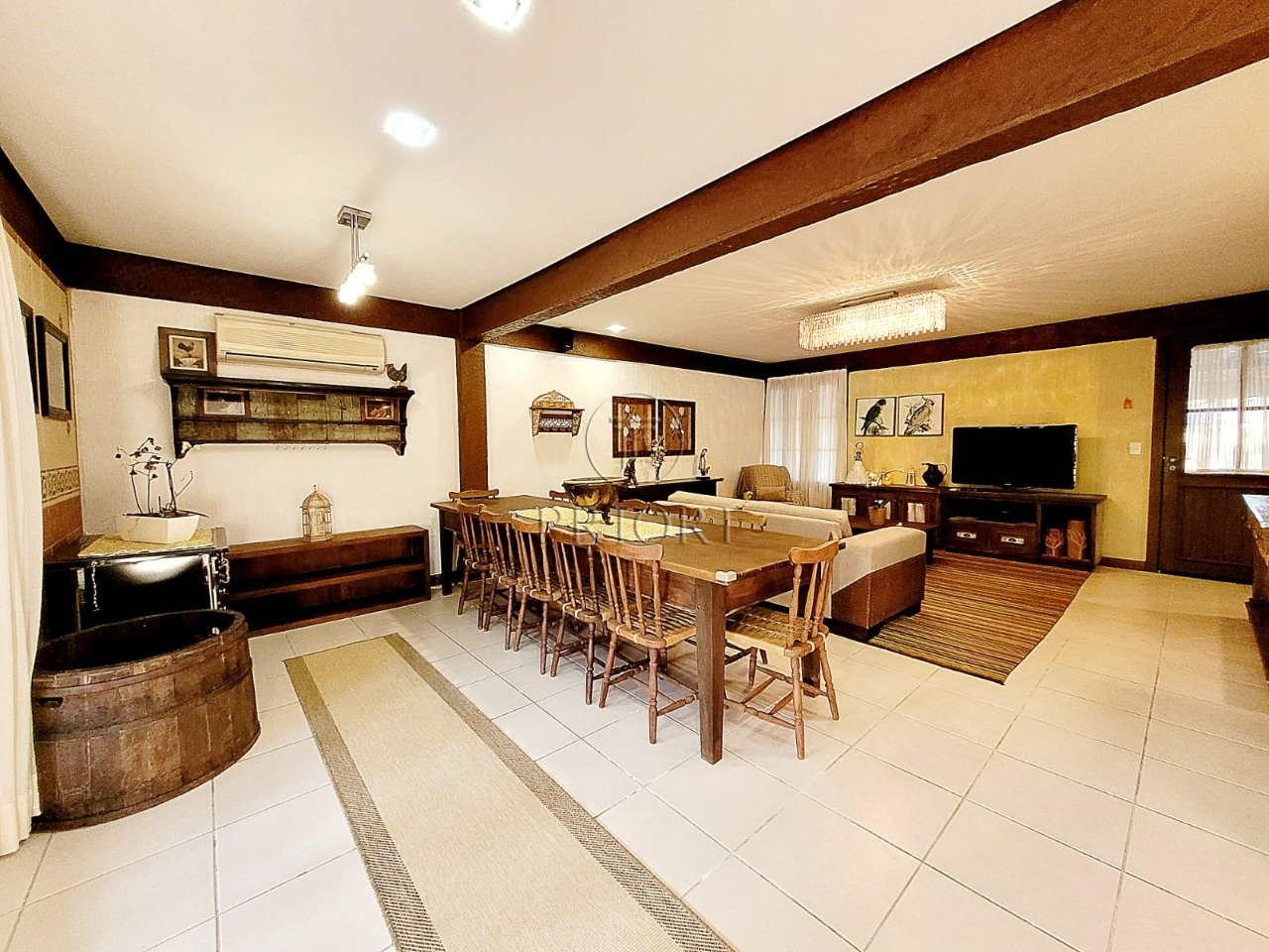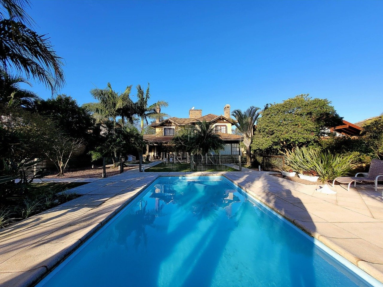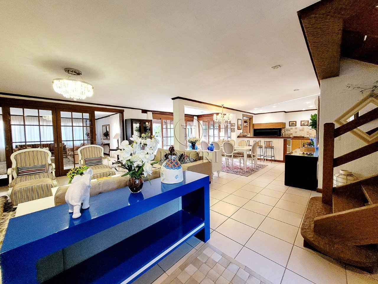 O pavimento inferior é composto de três gigantescas salas de estar, jantar e televisão, aberturas grandes possibilitando maior luminosidade, total privacidade e silêncio, vista belíssima e definida, e lareira. Espaço churrasco, ideal para reunir a família aos finais de semana. Lavabo. Cozinha totalmente montada com móveis planejados sob medida e os demais eletrodomésticos necessários. Área de serviço independente com aquecedor, lavadora/secadora de roupas e dependência de empregada. Pátio totalmente arborizado, pergolado, piscina e uma deslumbrante vista privilegiada para o lago.