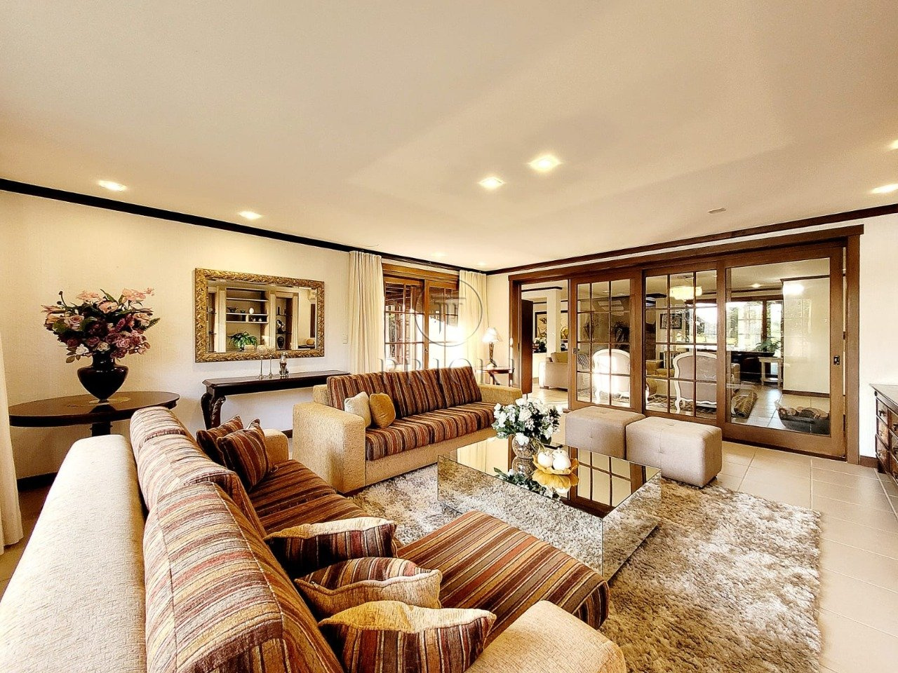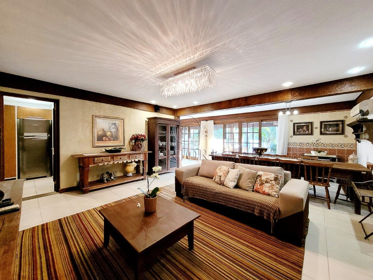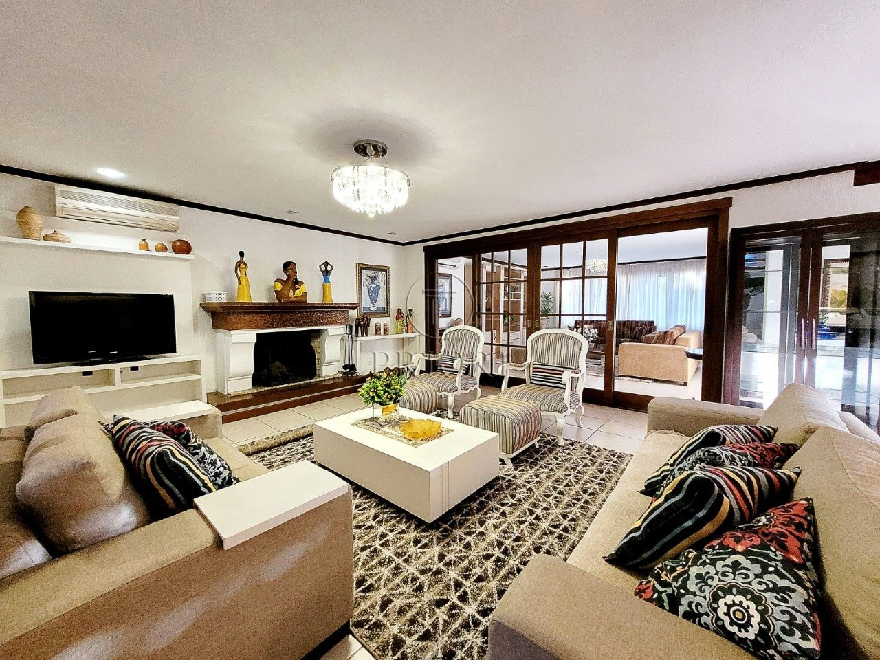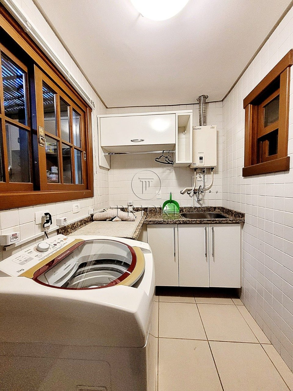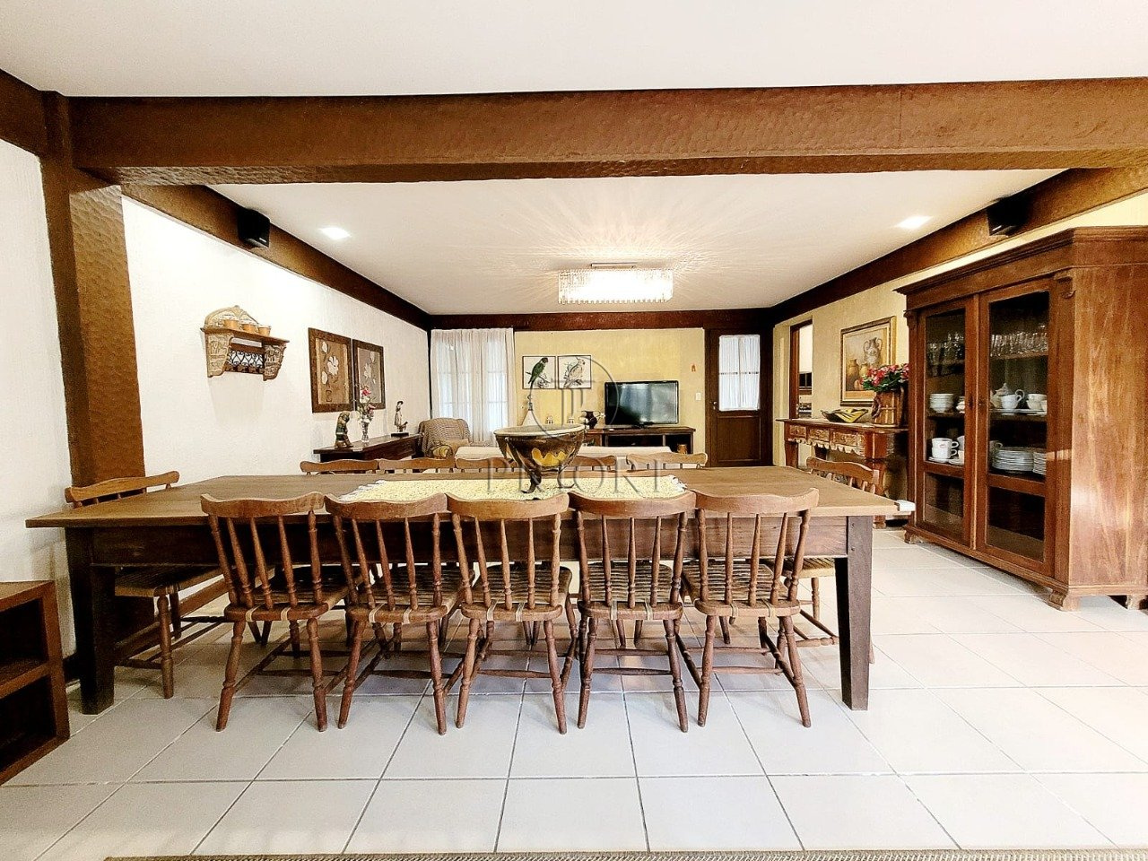 O pavimento inferior é composto de três gigantescas salas de estar, jantar e televisão, aberturas grandes possibilitando maior luminosidade, total privacidade e silêncio, vista belíssima e definida, e lareira. Espaço churrasco, ideal para reunir a família aos finais de semana. Lavabo. Cozinha totalmente montada com móveis planejados sob medida e os demais eletrodomésticos necessários. Área de serviço independente com aquecedor, lavadora/secadora de roupas e dependência de empregada. Pátio totalmente arborizado, pergolado, piscina e uma deslumbrante vista privilegiada para o lago.