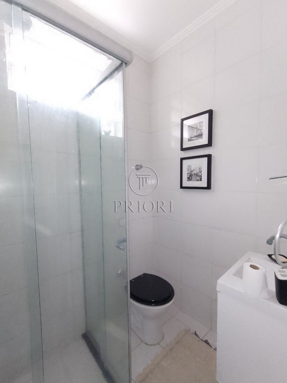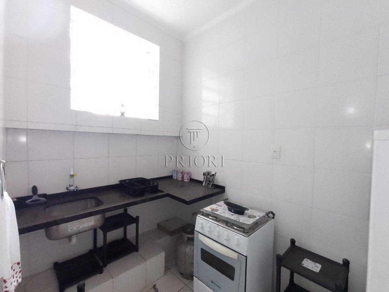 Amplo living integrado com quarto, banheiro social com chuveiro elétrico e cozinha completa.
