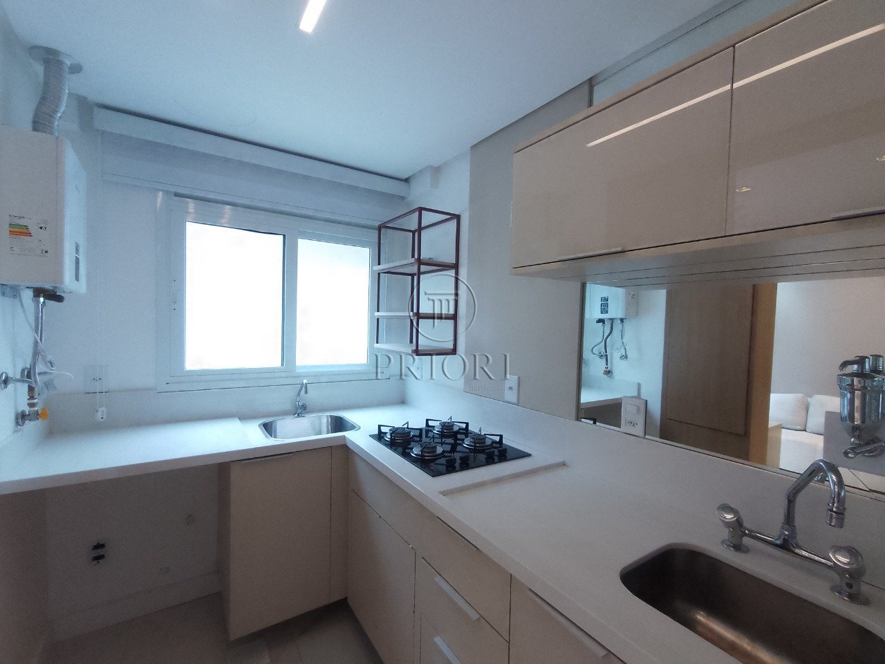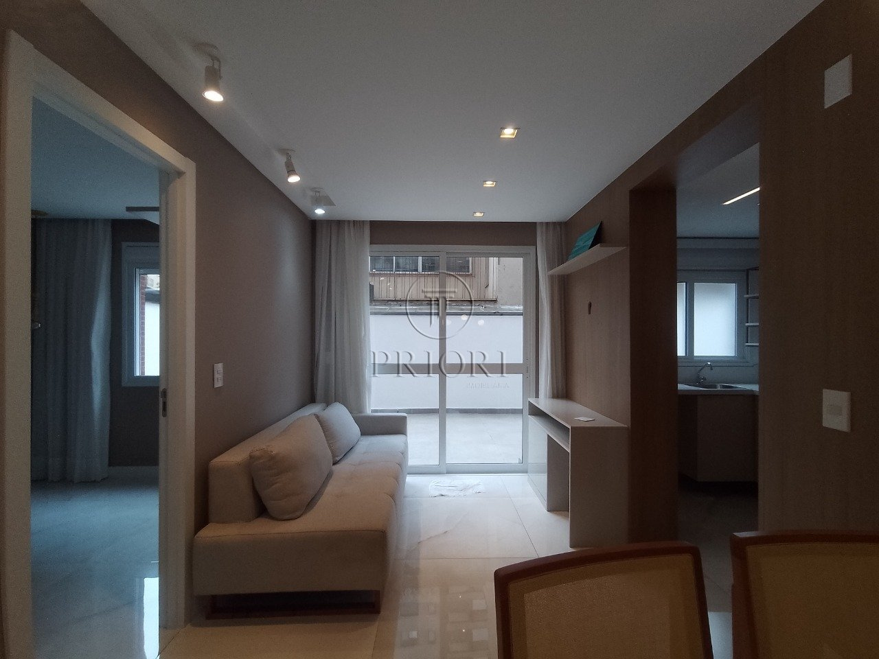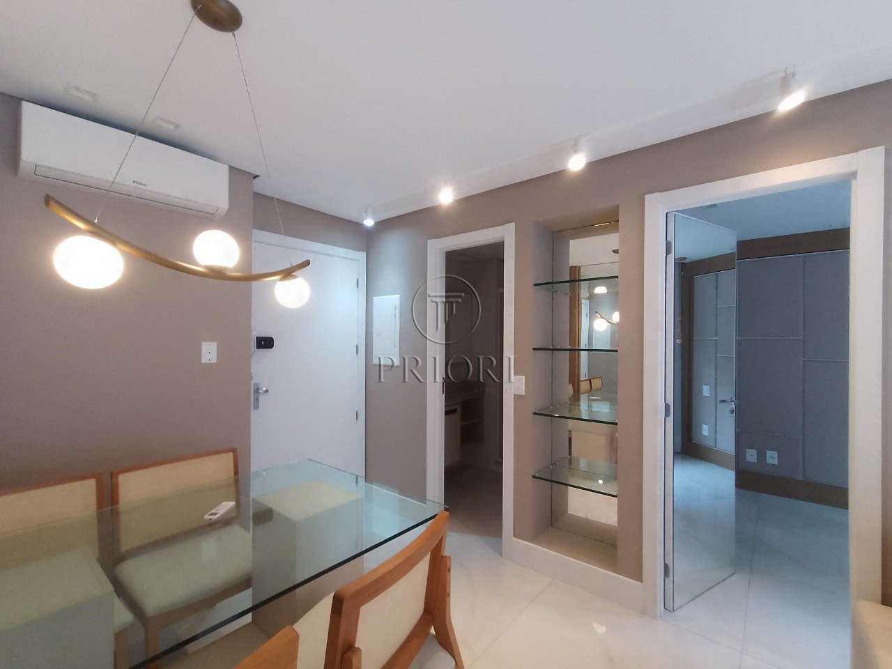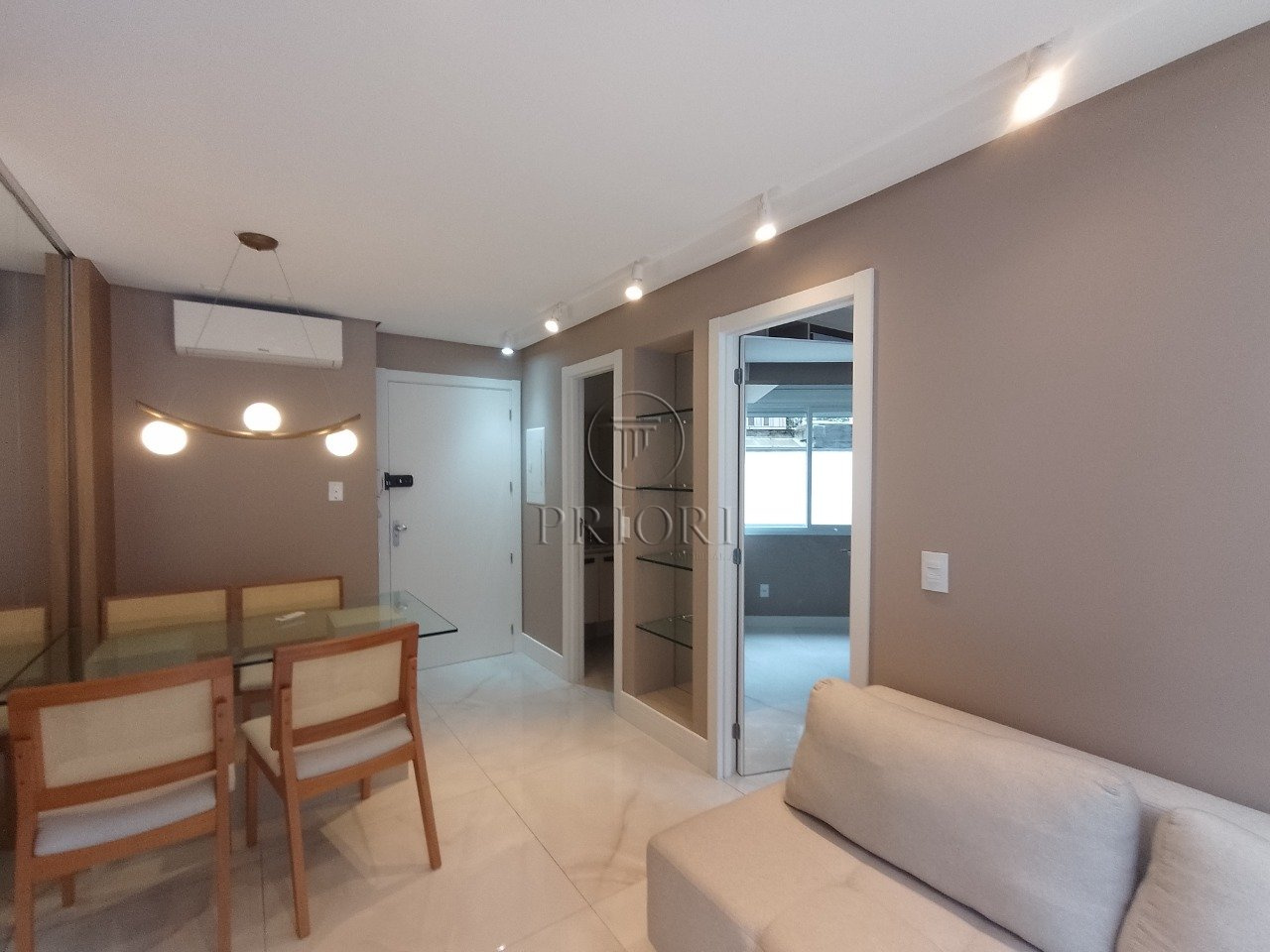 Imóvel decorado e climatizado em condições excelentes, com piso em porcelanato, medindo 60 m² privativos, um dormitório com armários planejados, living para dois ambientes, cozinha planejada com cooktop, banheiro social com chuveiro a gás, um amplo dormitório com armários, excelente área externa e uma vaga de garagem coberta.