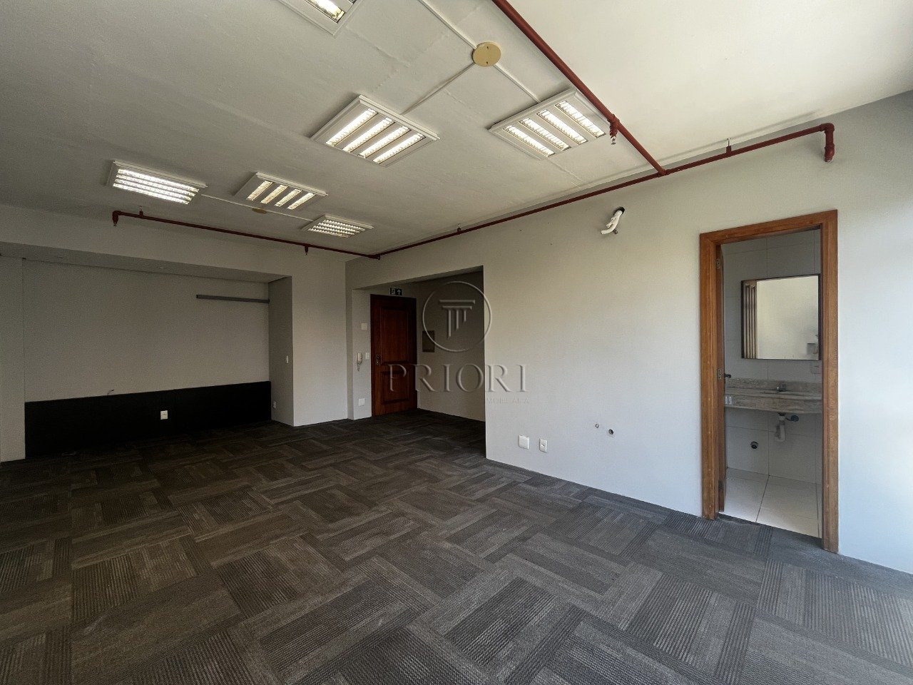 Sala comercial com 55m², ambiente para recepção, com carpete, banheiro e espera para ar condicionado.