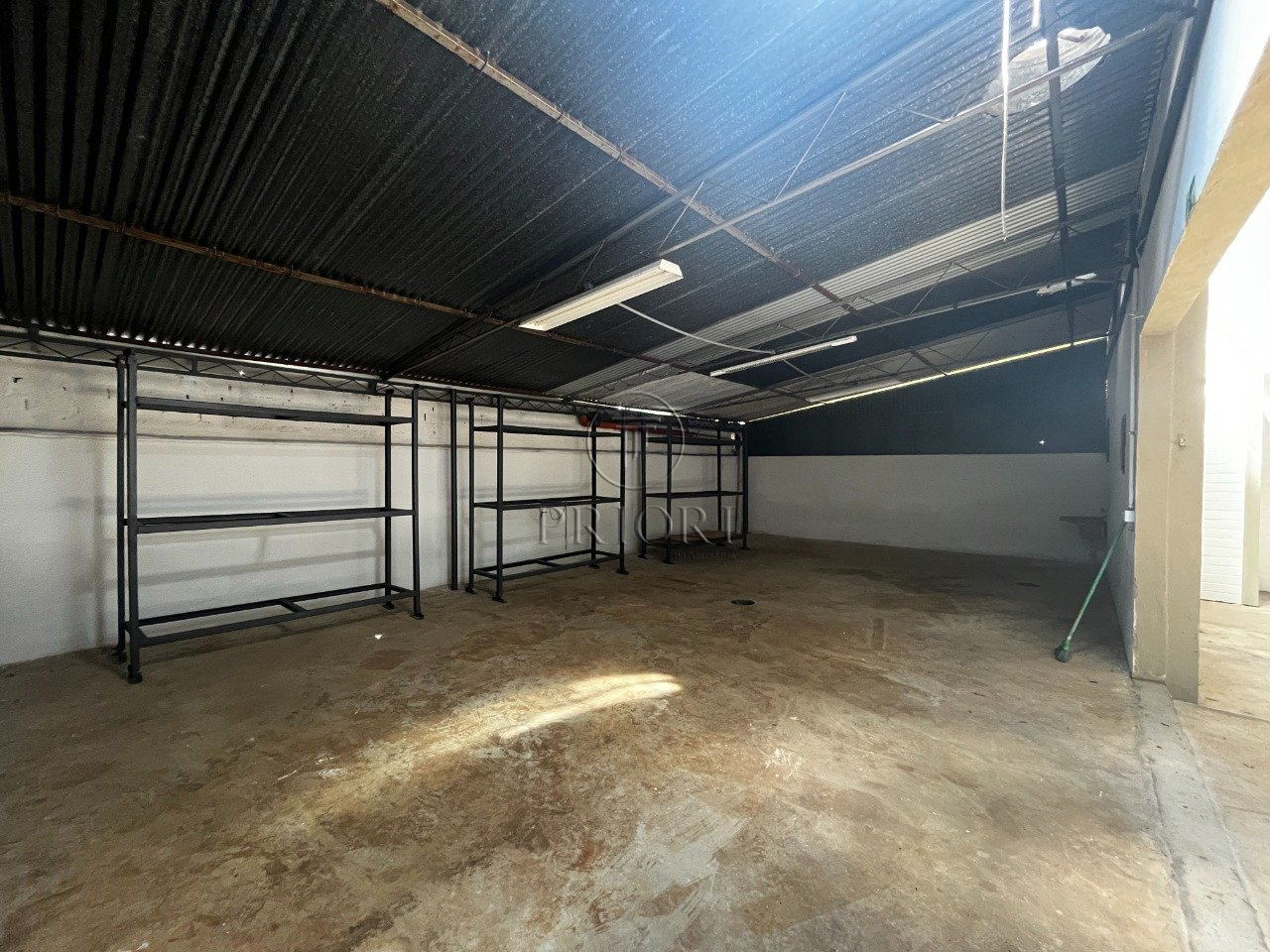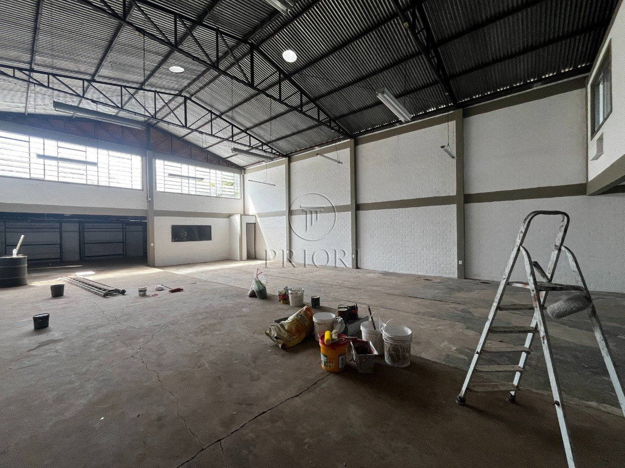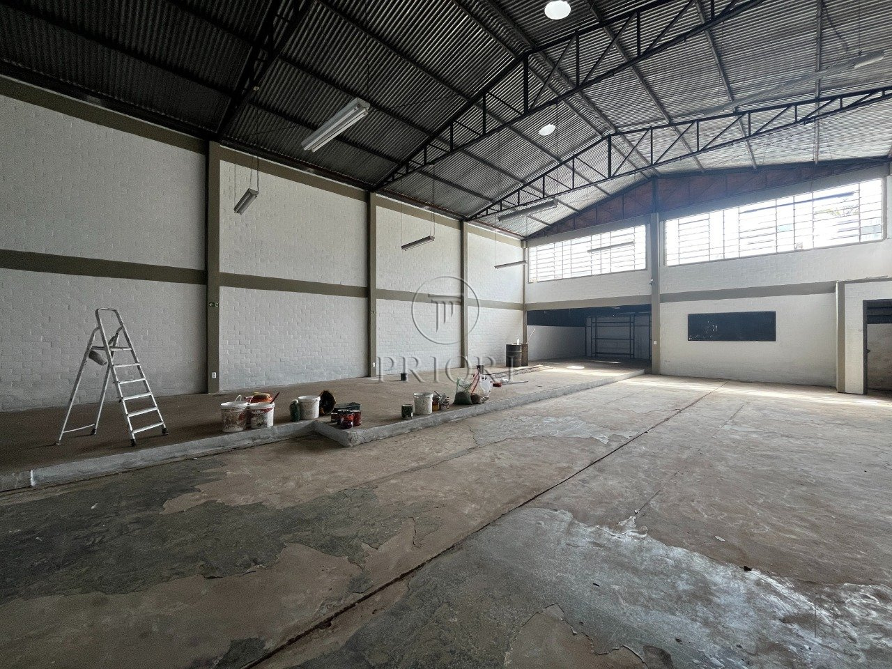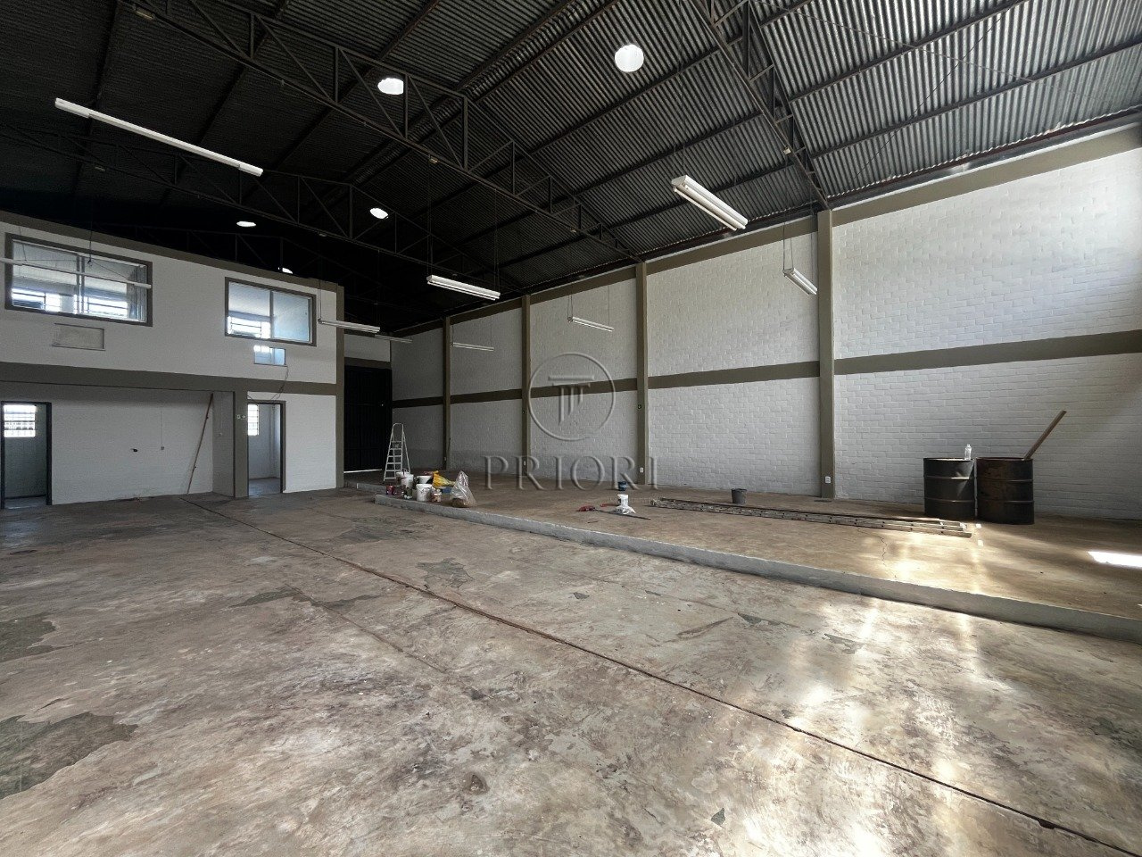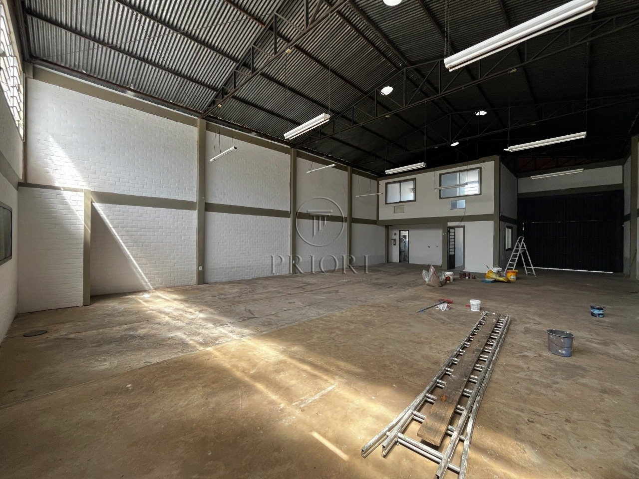 Depósito com 250m² de área privativa, 6m de pé direto, 2 banheiros, mezanino com 2 salas para escritórios, portão com acesso para caminhão.