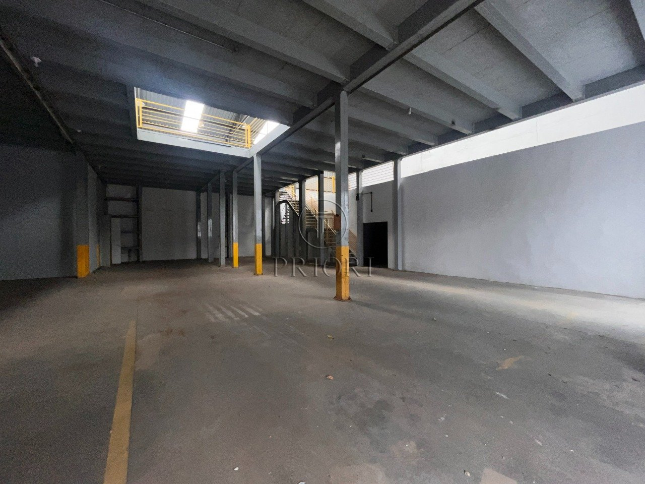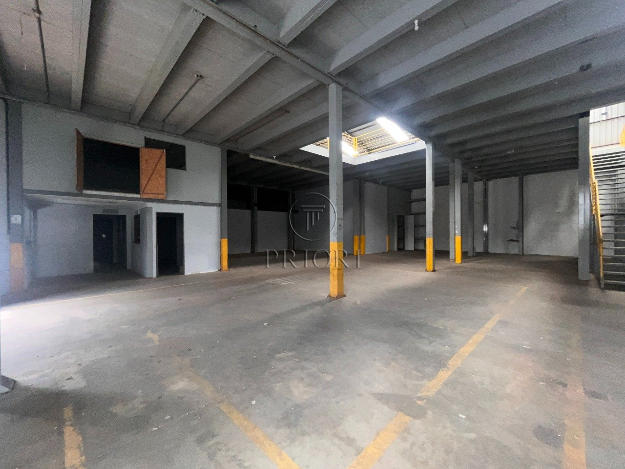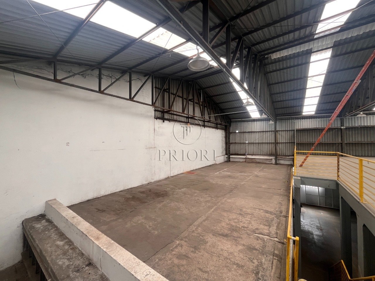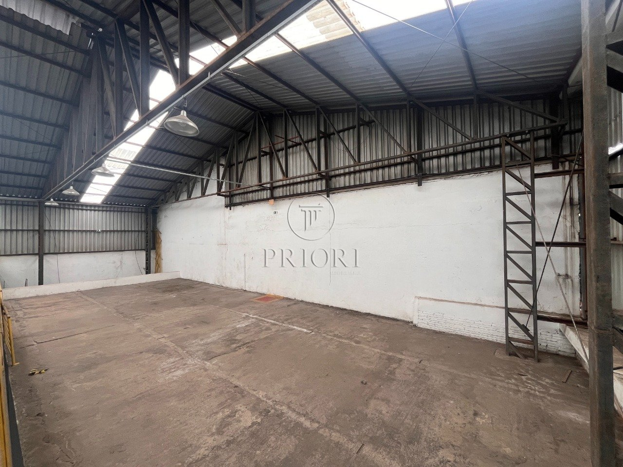 Depósito com 1500m² de área privativa, pé direto alto, mezanino com espaço para armazenamento e salas para escritórios, banheiros e vestiários, vagas de estacionamento lateral.