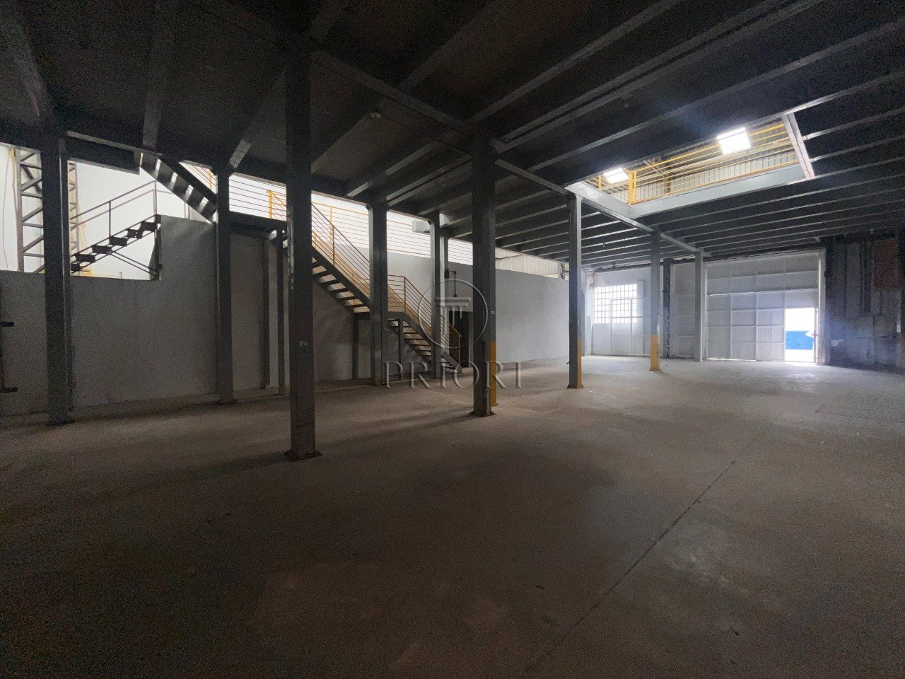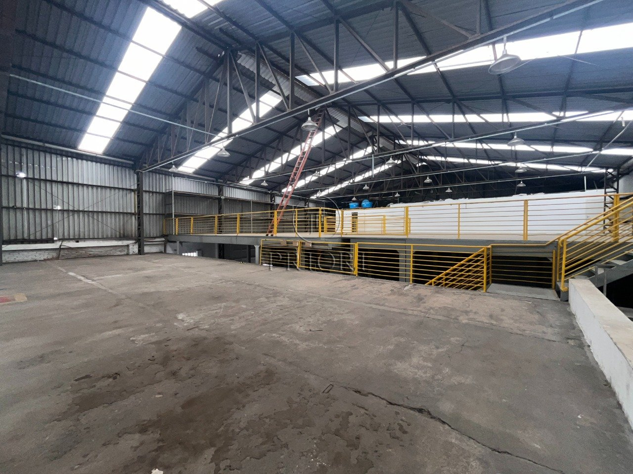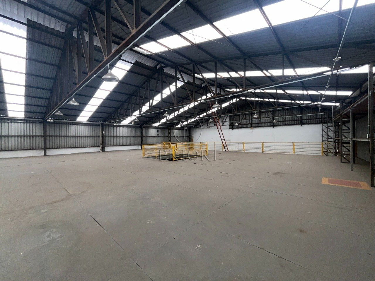Depósito com 1500m² de área privativa, pé direto alto, mezanino com espaço para armazenamento e salas para escritórios, banheiros e vestiários, vagas de estacionamento lateral.