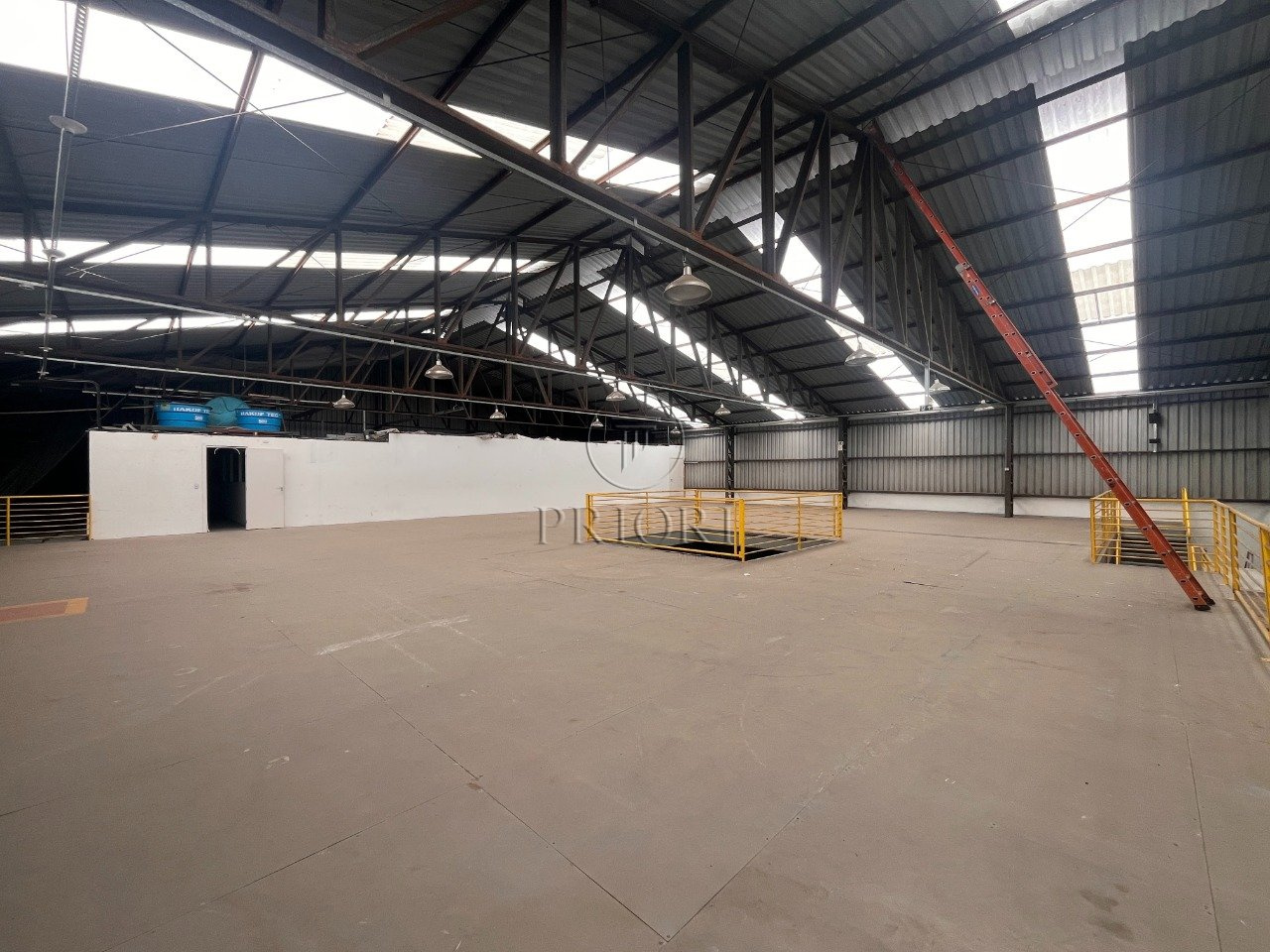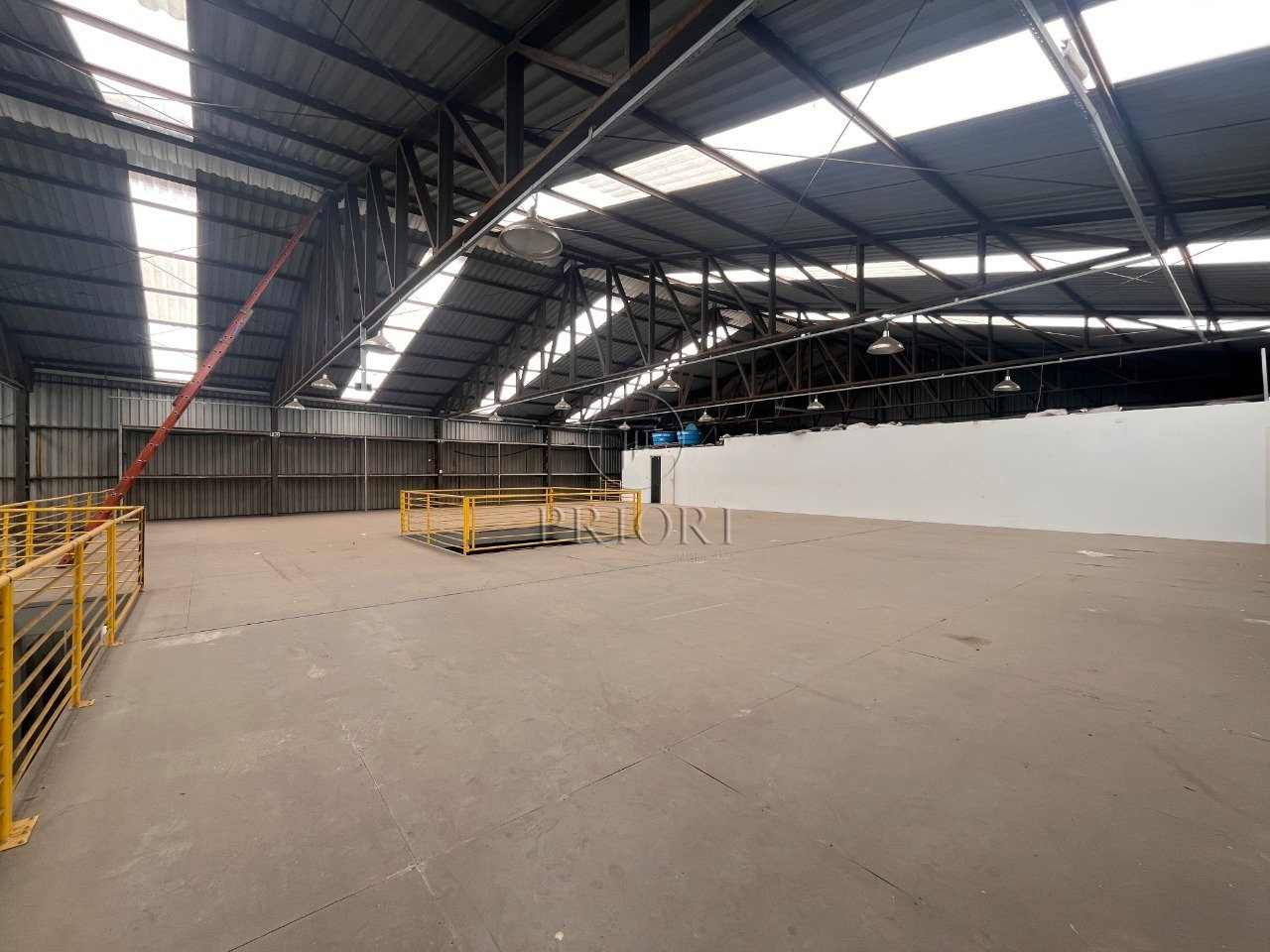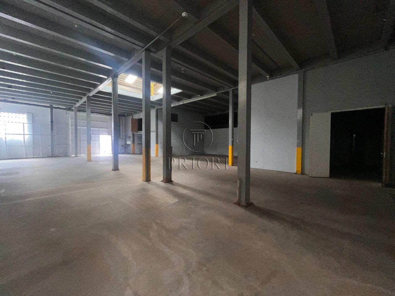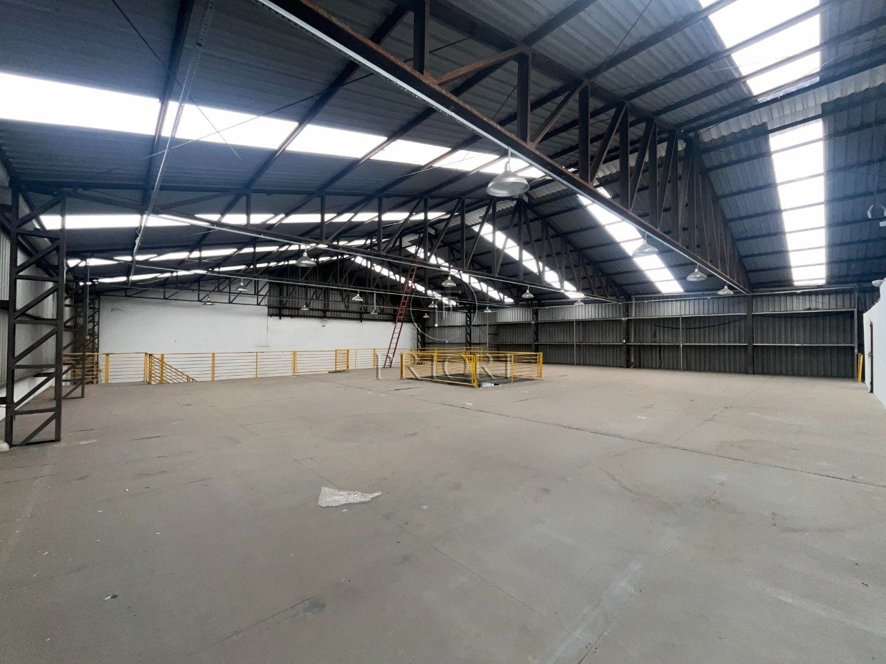 Depósito com 1500m² de área privativa, pé direto alto, mezanino com espaço para armazenamento e salas para escritórios, banheiros e vestiários, vagas de estacionamento lateral.