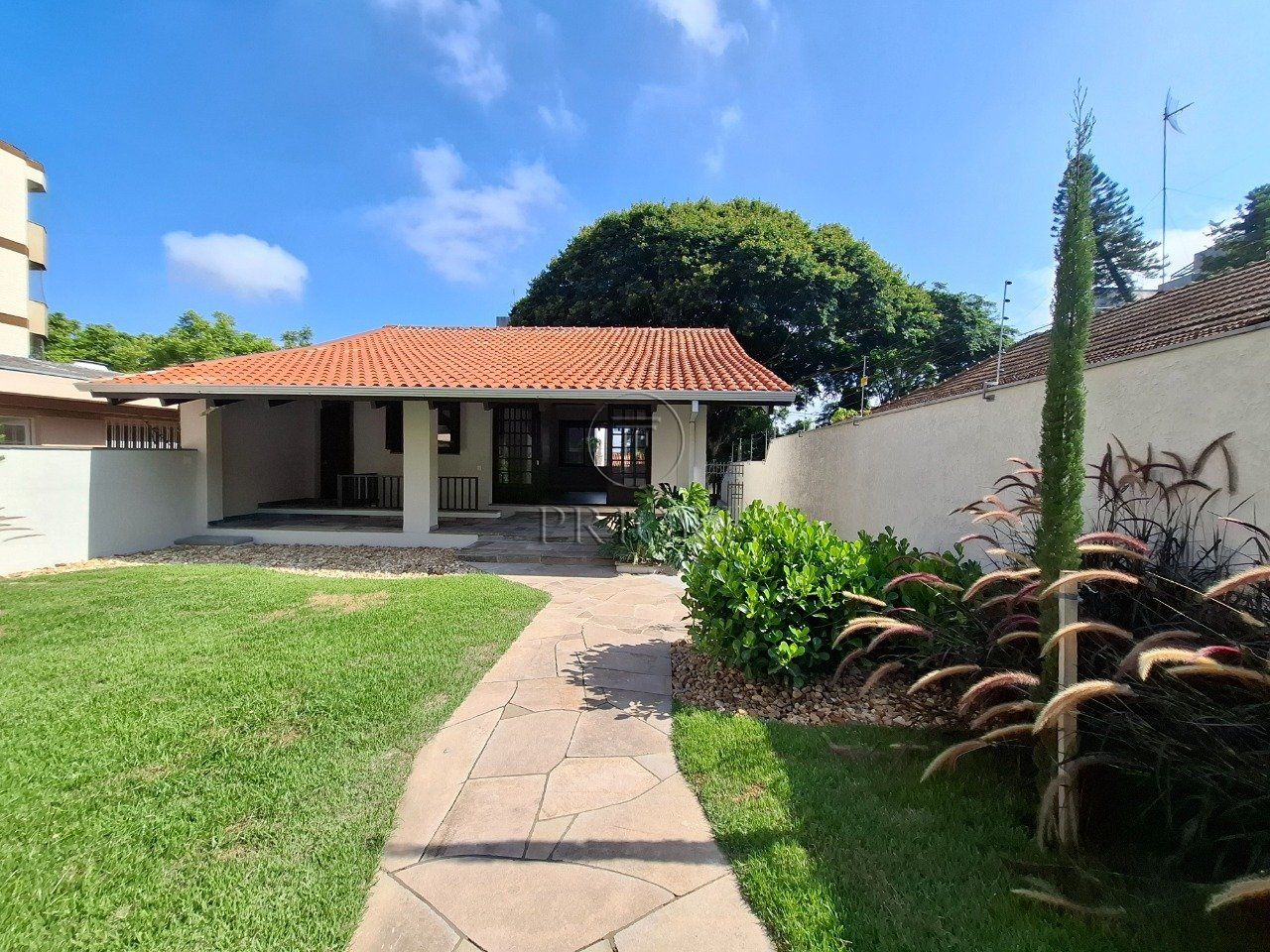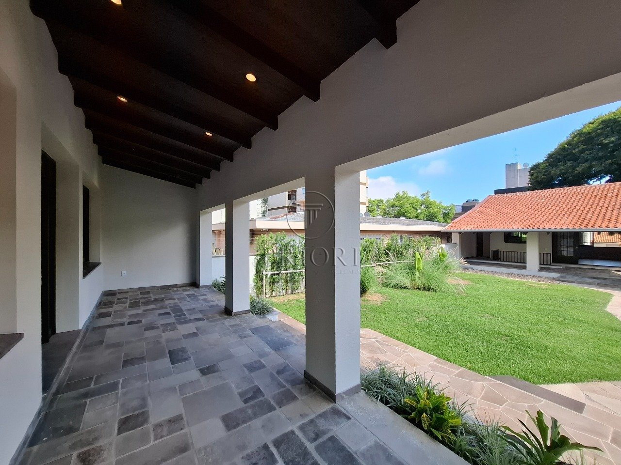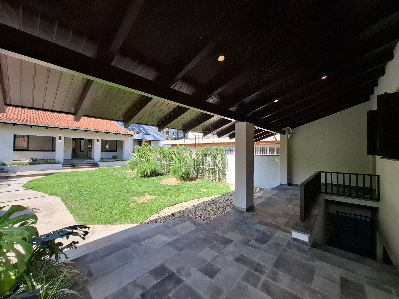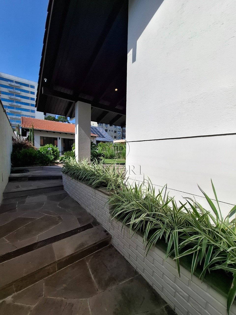 Na parte frontal, temos no primeiro pavimento garagem para até 4 veículos pequenos ou 3 de grande porte, já no segundo pavimento, temos ampla sala com 2 banheiros, lindo jardim levando até o segundo anexo da casa, onde temos mais um amplo salão, mais 2 banheiros, cozinha e mais um pátio menor nos fundos.