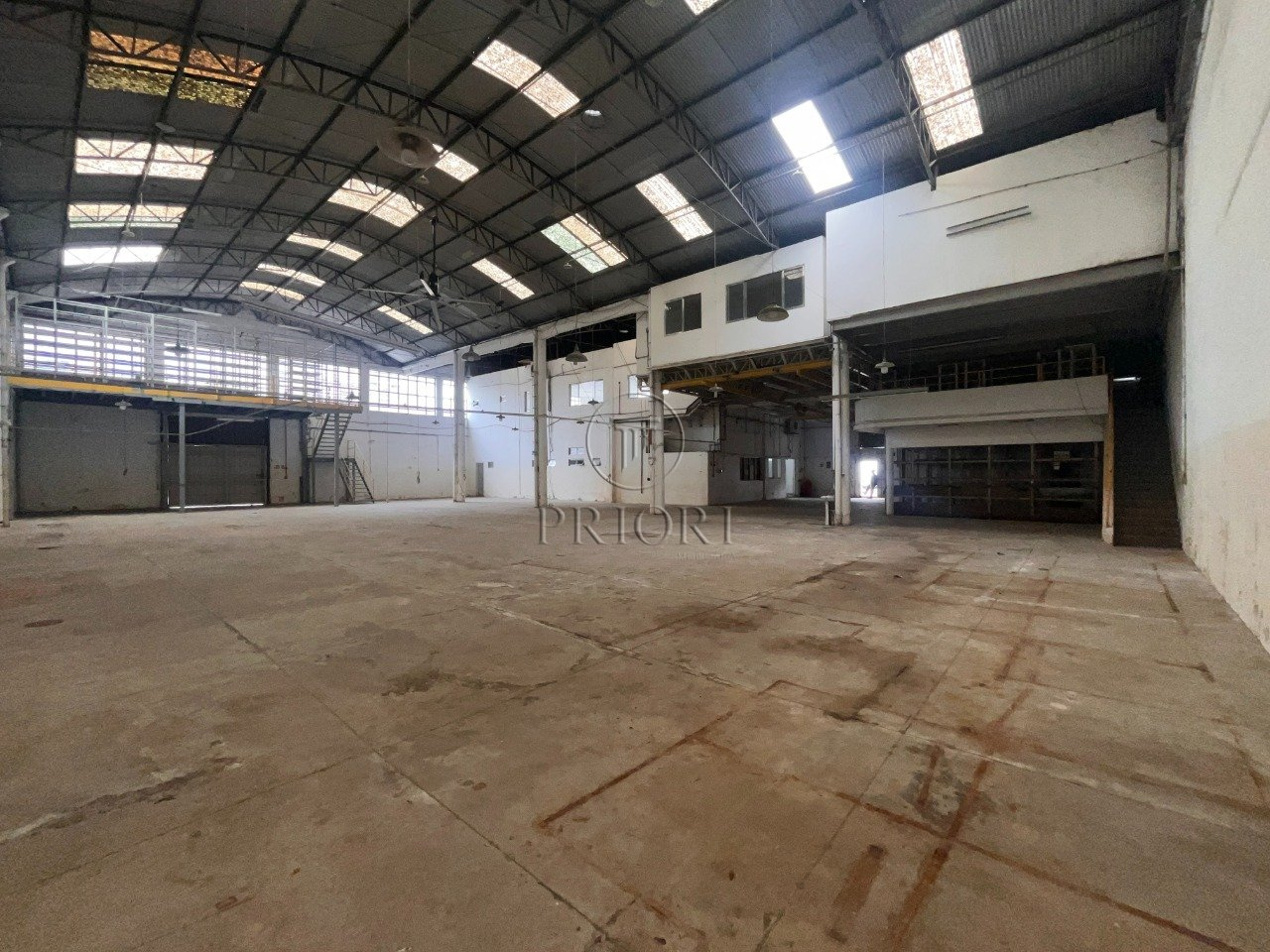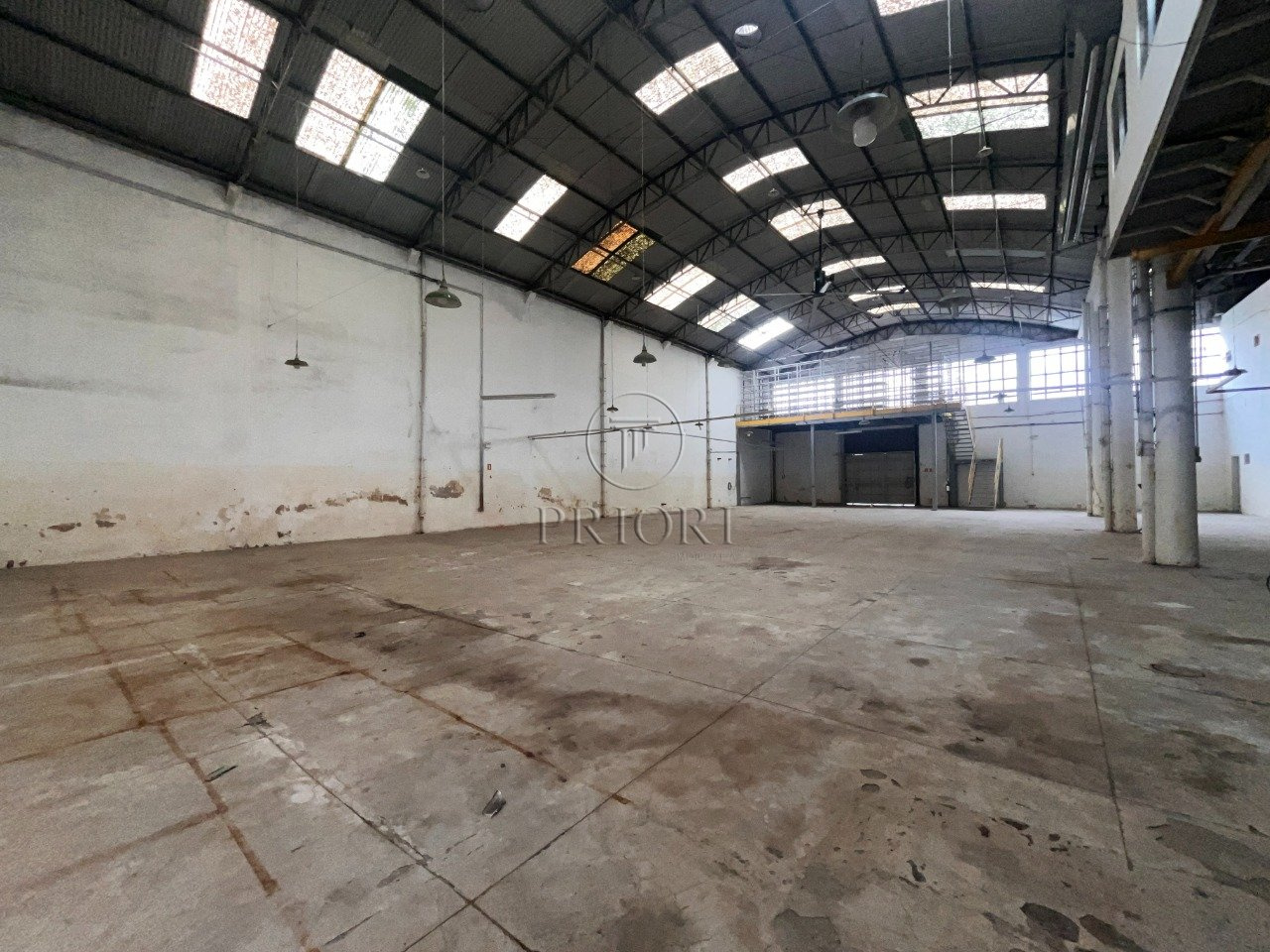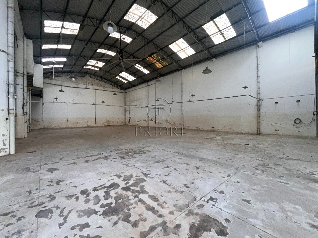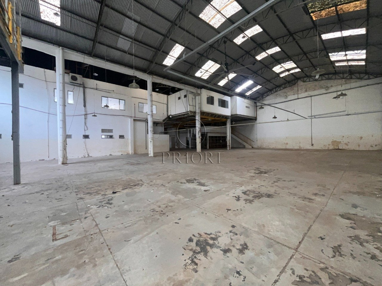 Depósito com 1400m² de área privativa, pé direto alto, mezanino com espaço para armazenamento e salas para escritórios, banheiros e vestiários, refeitório e cozinha.