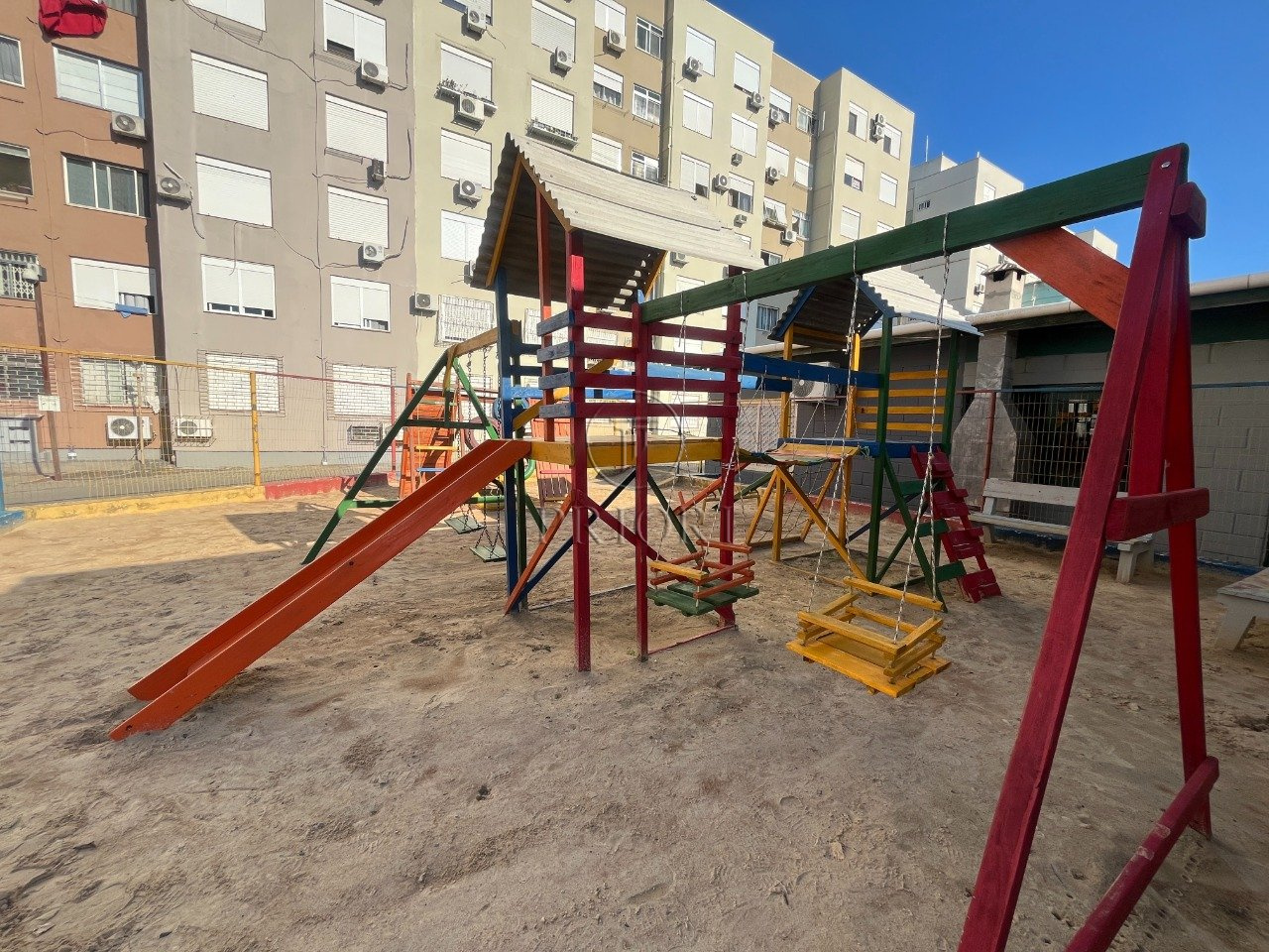 Condomínio com interfone, portão eletrônico, câmera de segurança, elevador, playground, sala de festa e churrasqueira.