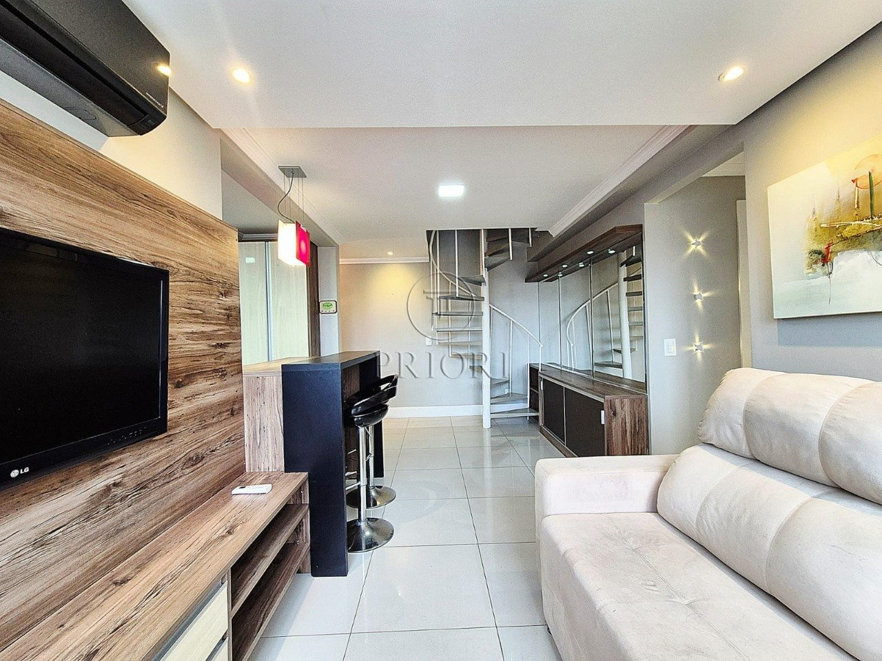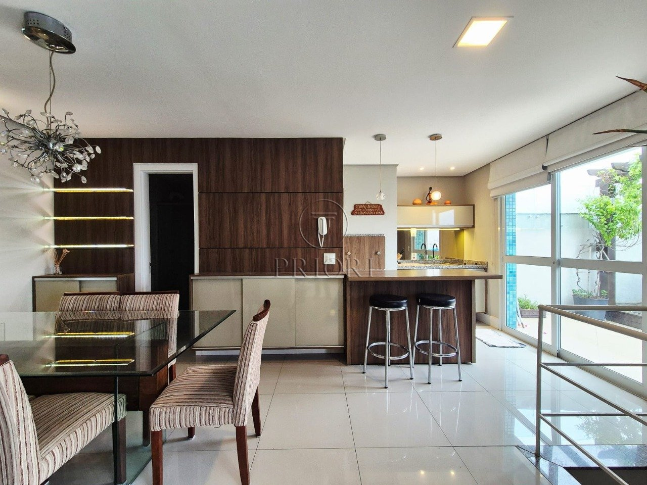 A parte inferior dispõe de dois dormitórios, bem amplos, ensolarados, climatizados e com armários planejados sob medida. Banheiro social bem arejado e com ventilação natural. Living para dois ambientes bem definidos, aberturas grandes possibilitando maior luminosidade, total privacidade e silêncio, vista perene e definida, piso em porcelanato e iluminação diferenciada. Cozinha estilo americana com total integração ao living, montada e equipada com armários planejados sob medida e os demais eletrodomésticos e utilitários necessários. Área de serviço independente com aquecedor, tanque e lavadora/secadora de roupas.
