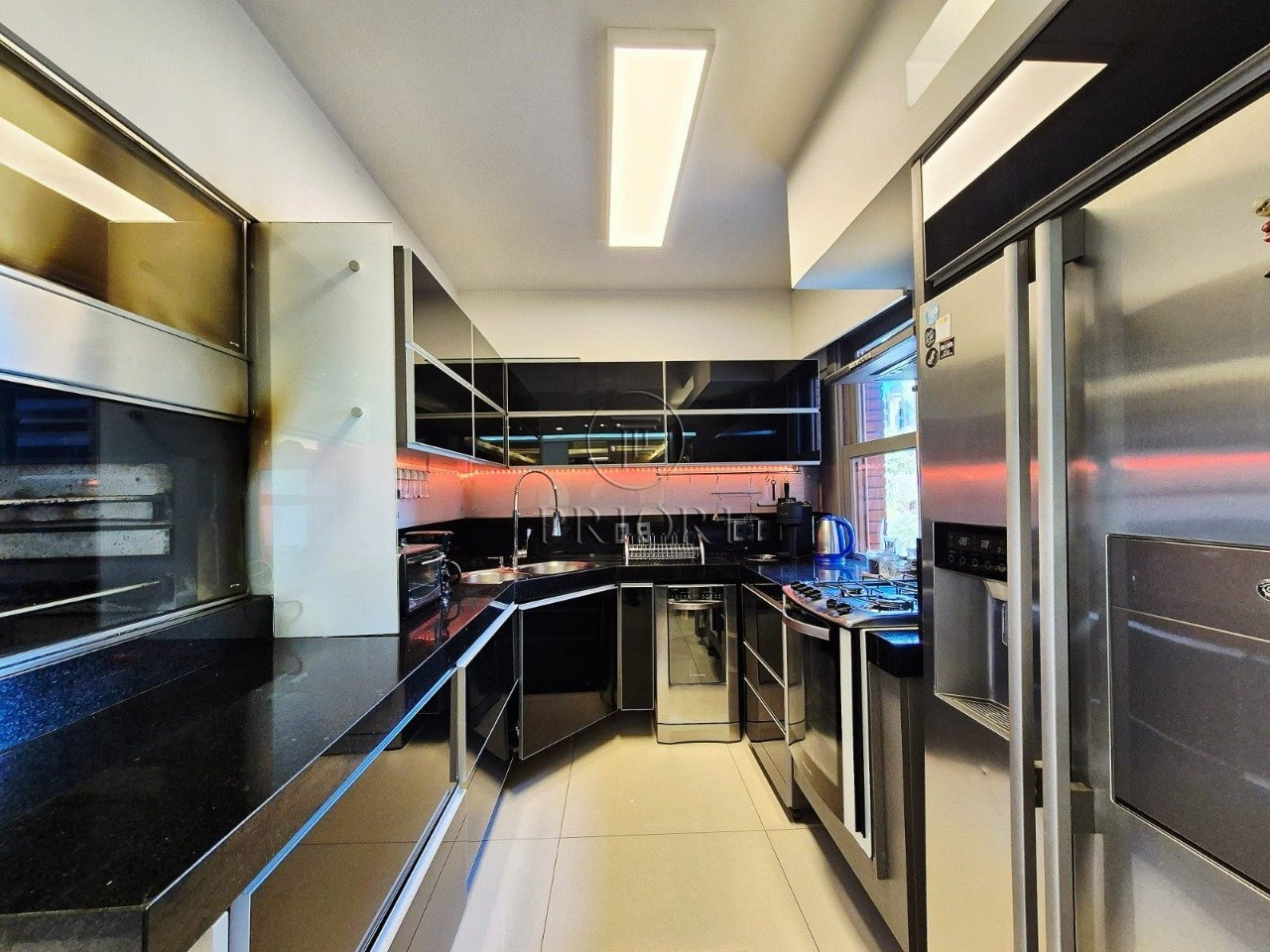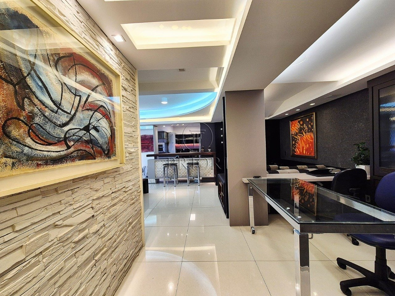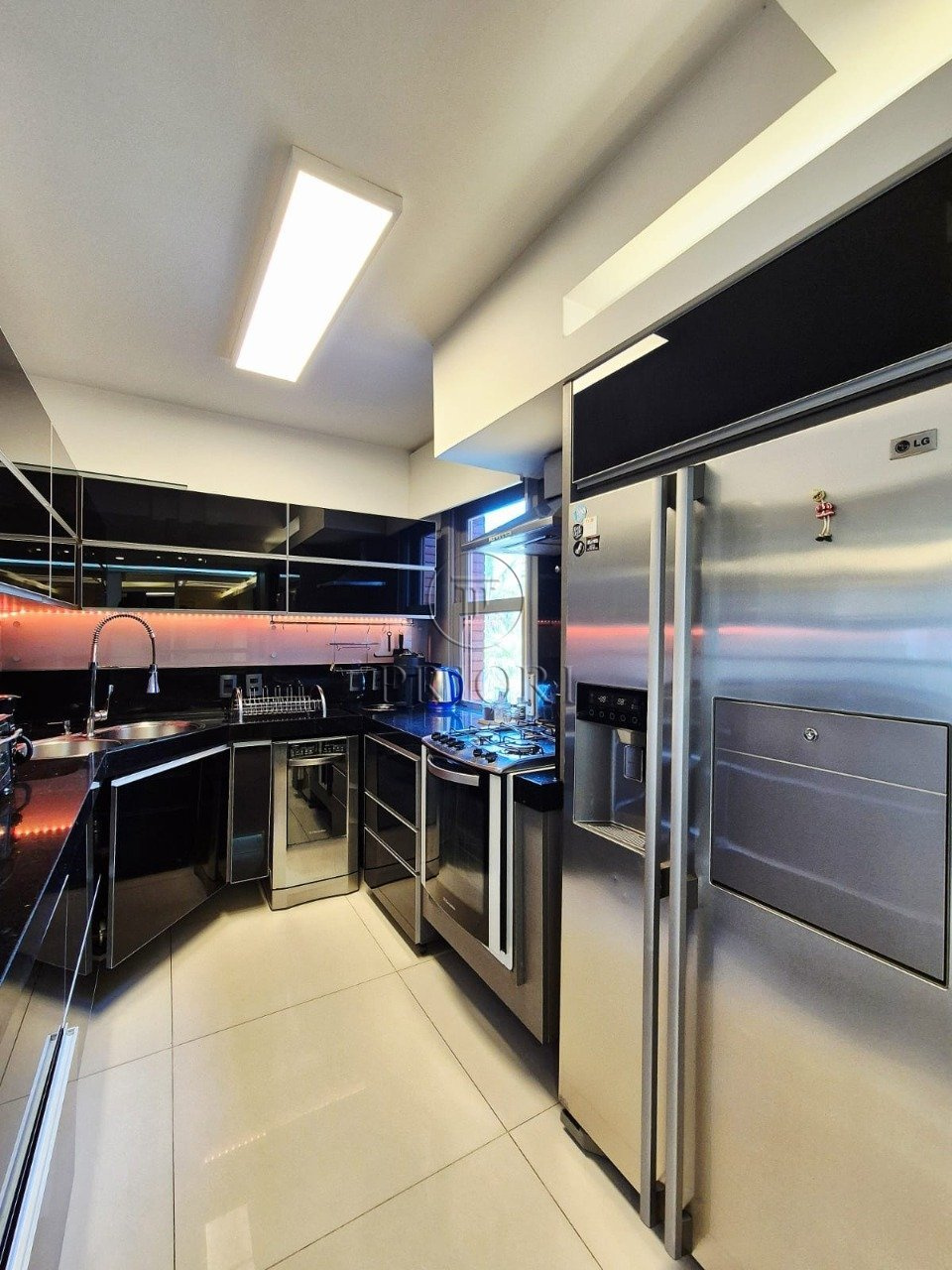 O imóvel dispõe de três dormitórios sendo um com suíte master e dois com closet, todos muito amplos e ensolarados. Banheiro social finamente decorado, azulejos e piso frio com perfeito acabamento. Living para três ambientes, espelhado, com escritório, armários e os demais mobiliários. Lavabo. Cozinha estilo americana com total integração ao living com churrasqueira privativa, armários planejados sob medida e os demais eletrodomésticos necessários. Área de serviço independente com lavadora de roupas, aquecedor e tanque.