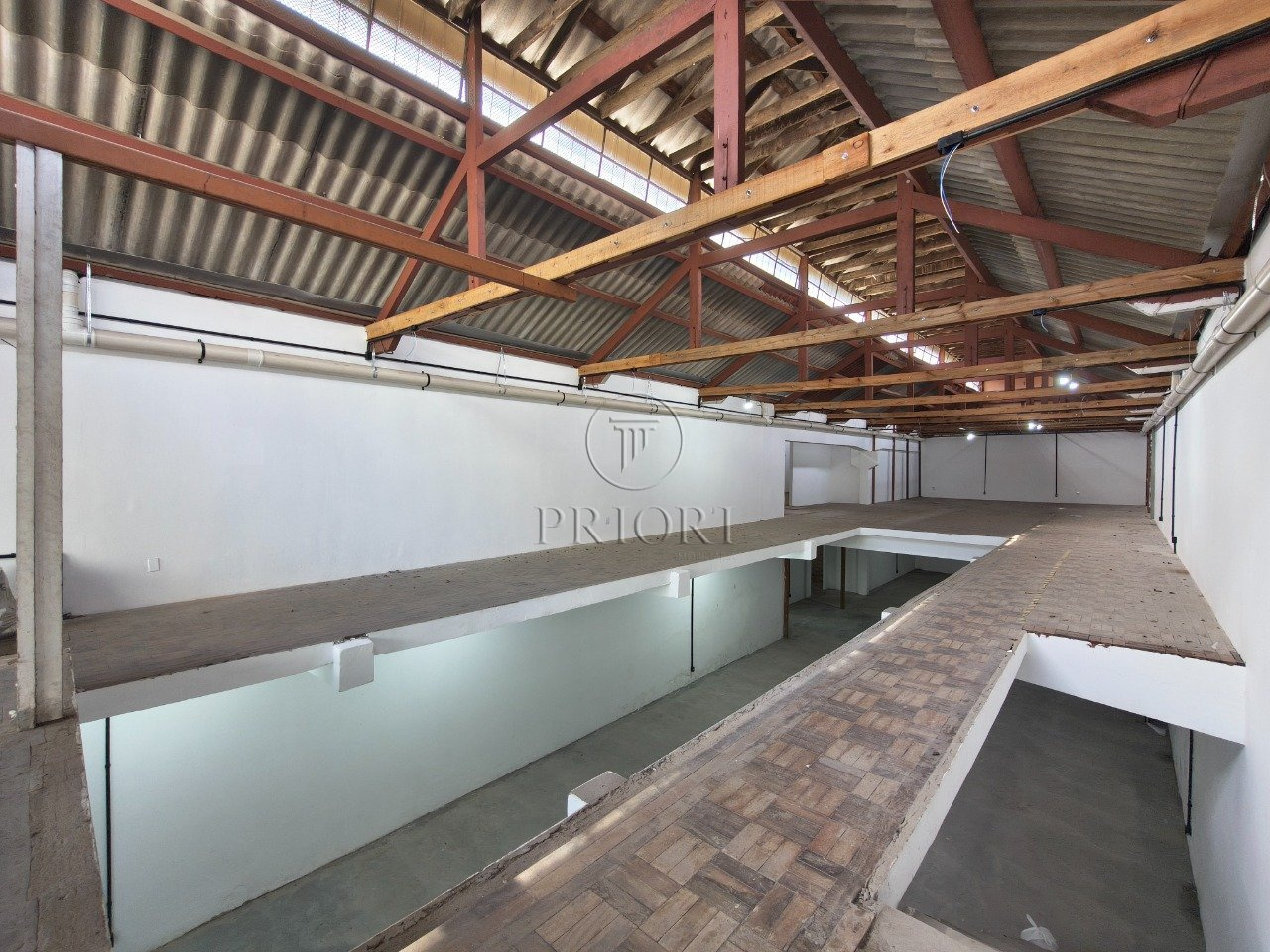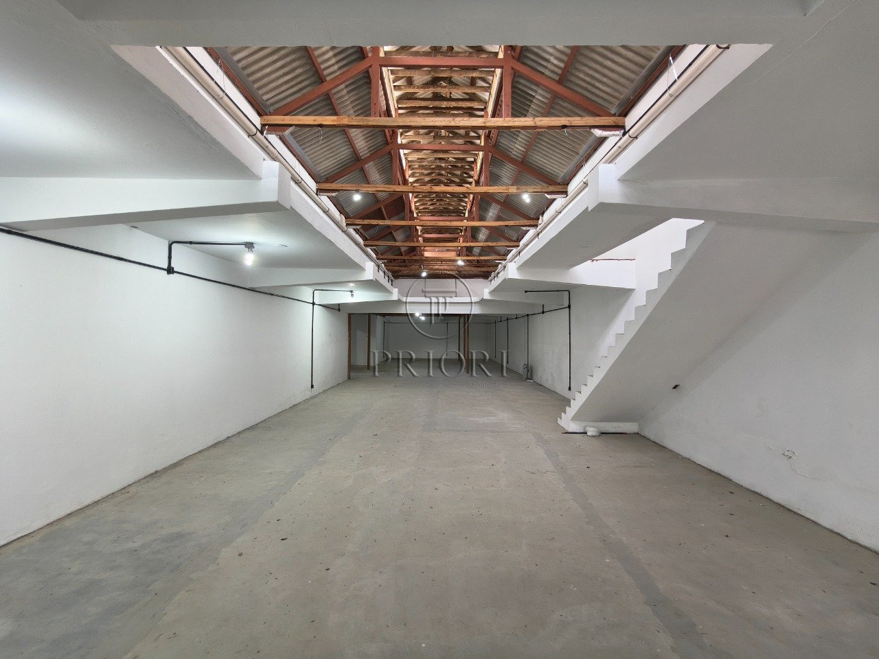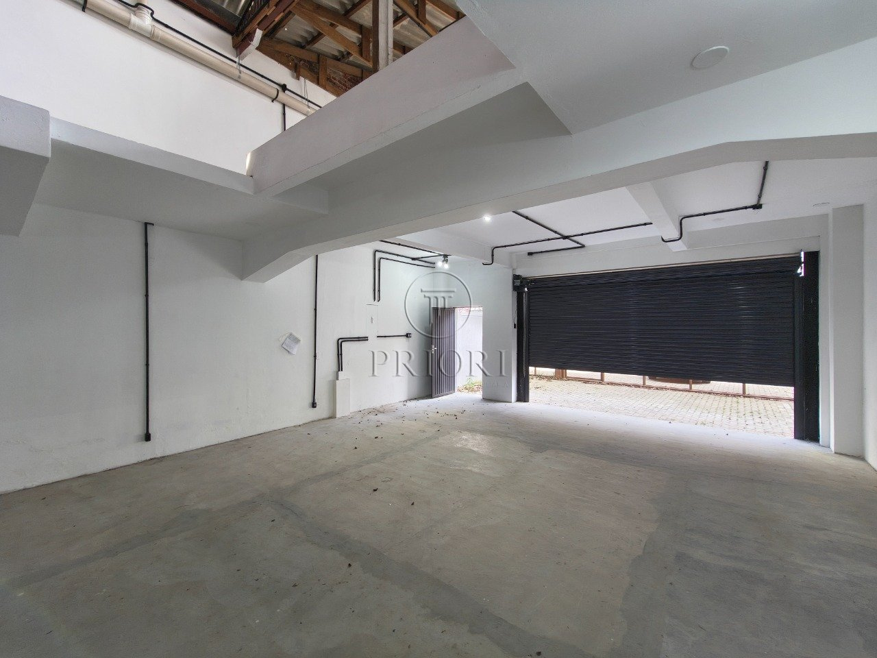 Amplo depósito reformado com 600m² de área privativa, dois pavimentos, banheiros, cozinha e pátio frontal com gradil.