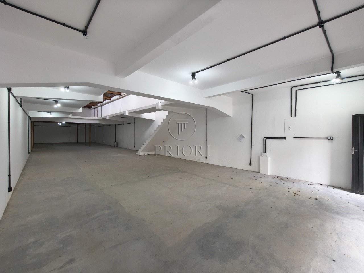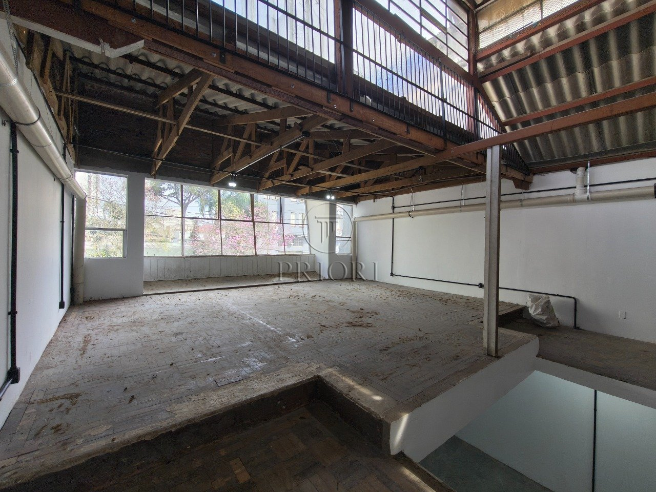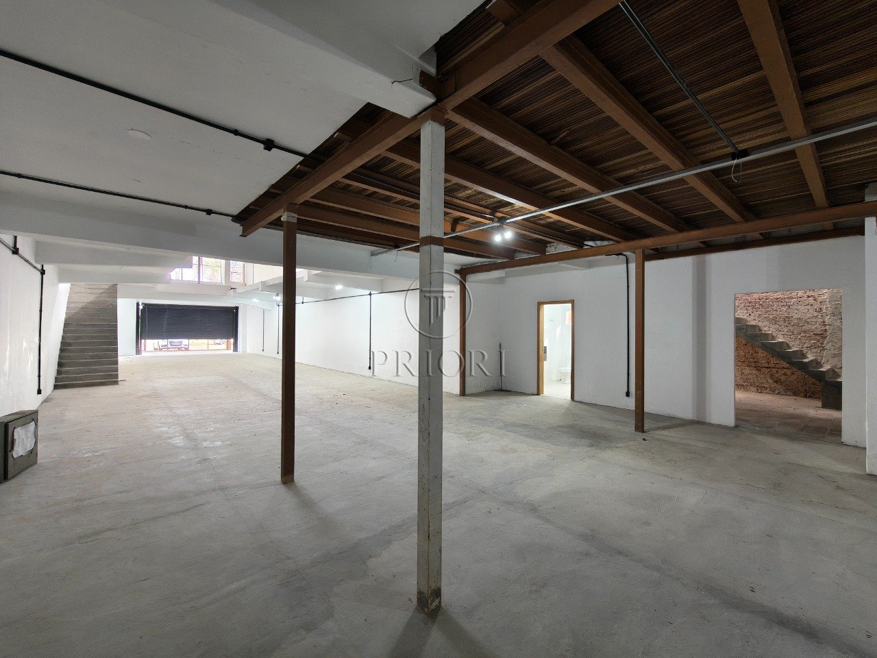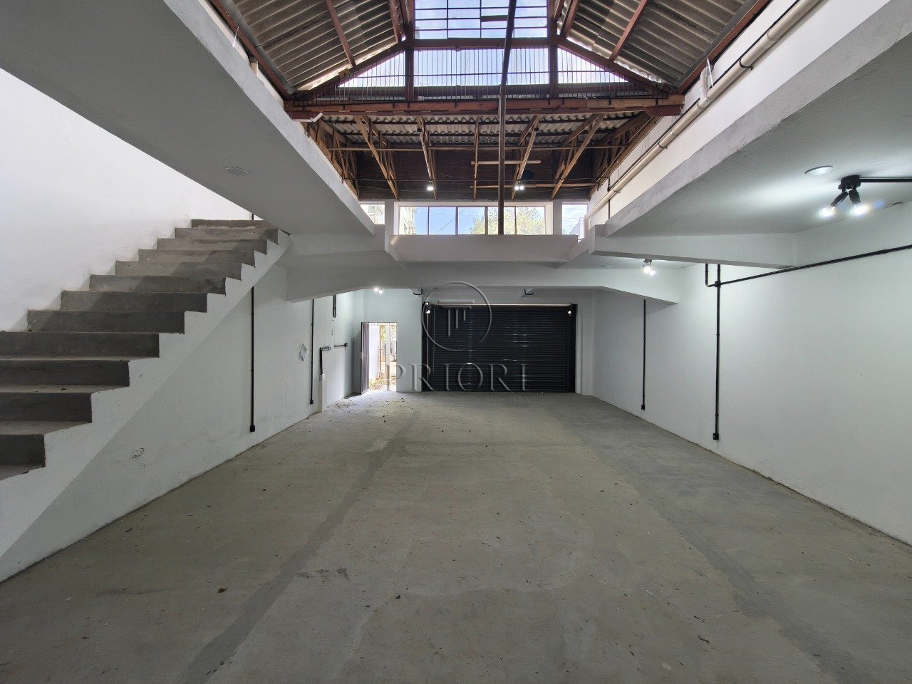Amplo depósito reformado com 600m² de área privativa, dois pavimentos, banheiros, cozinha e pátio frontal com gradil.